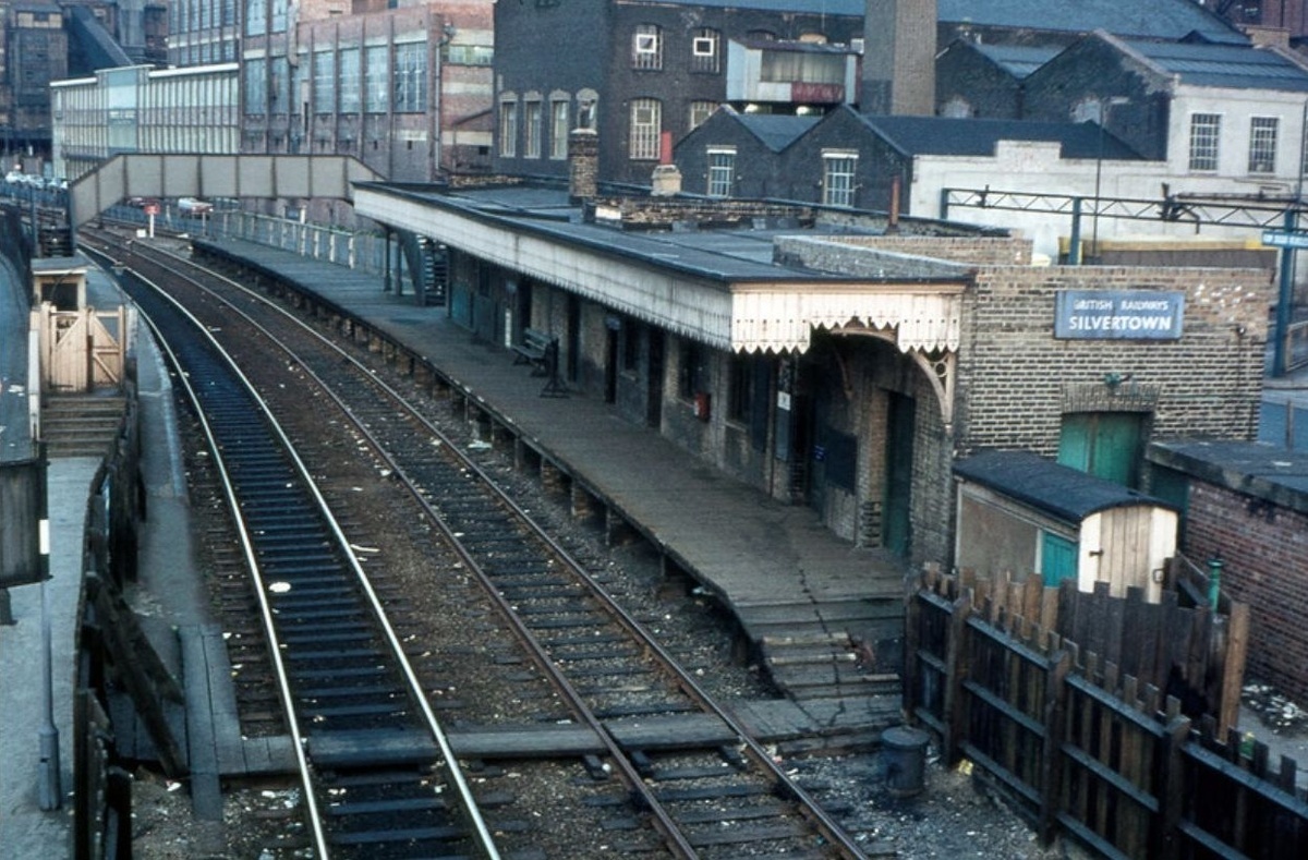 На фото мы видим станцию "Сильвертаун" в её наиболее унылом обличье: деревянная платформа с облупившейся краской, газовые фонари и редкие пассажиры, ожидающие поезд, который курсировал нечасто и недалеко. На заднем плане — сахарный завод «Тейт энд Лайл», который, несмотря на все перипетии времени, продолжает работать и сегодня.