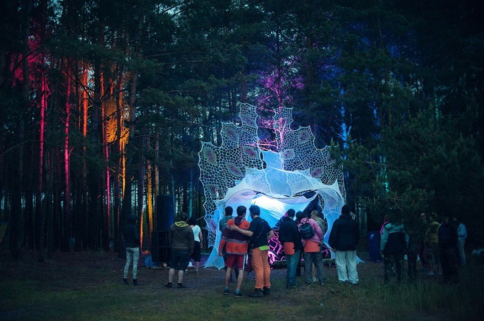 Как вариант - вы можете использовать белую сетчатую ткань, она дешевле, накупить светодиодов и распихать их везде как подсветку... Взять в аренду два прожектора и спрятать их в лесу сзади диджейки и подстветить деревья! Недавно под Киевом прошел опен-эйр, люди говорили, что видели тени деревьев ночью на облаках)) Затраты небольшие)