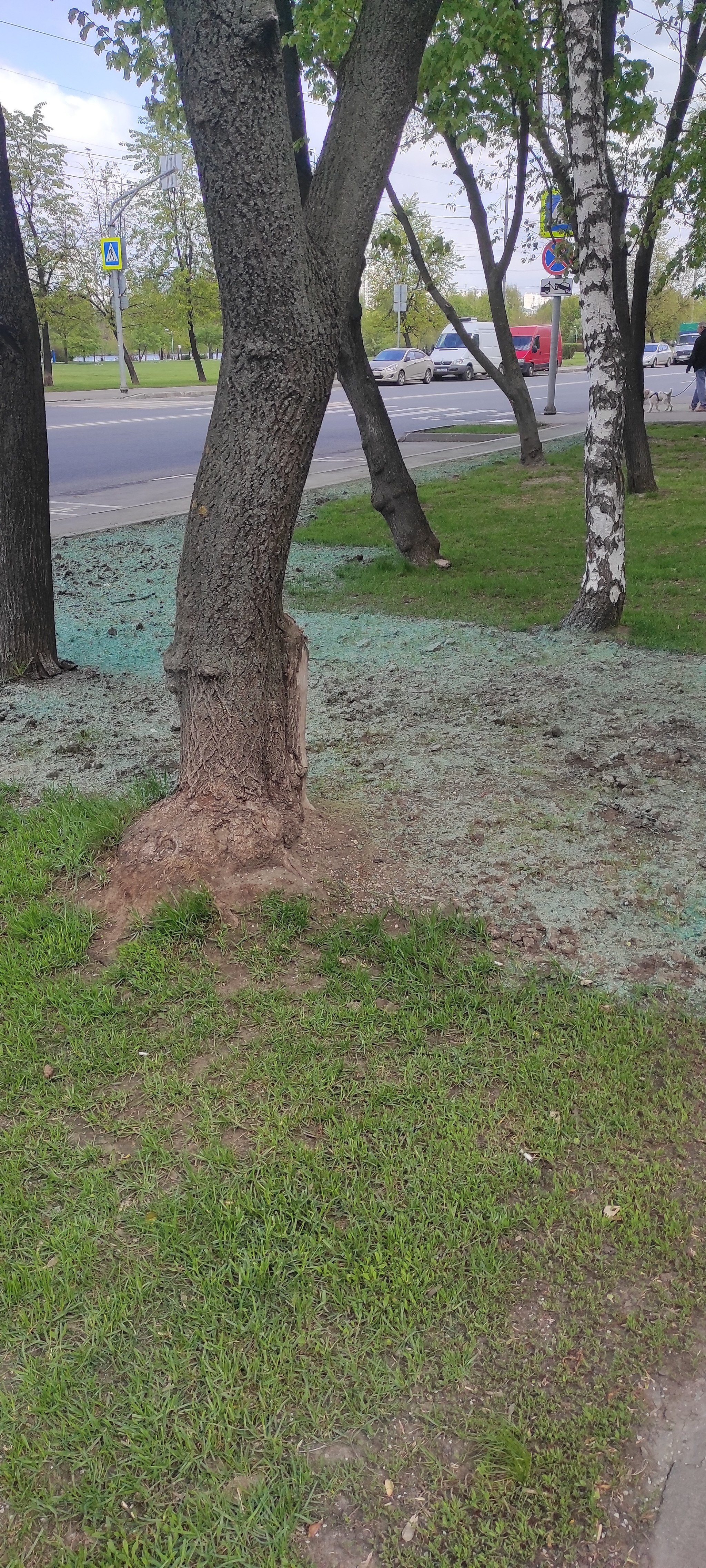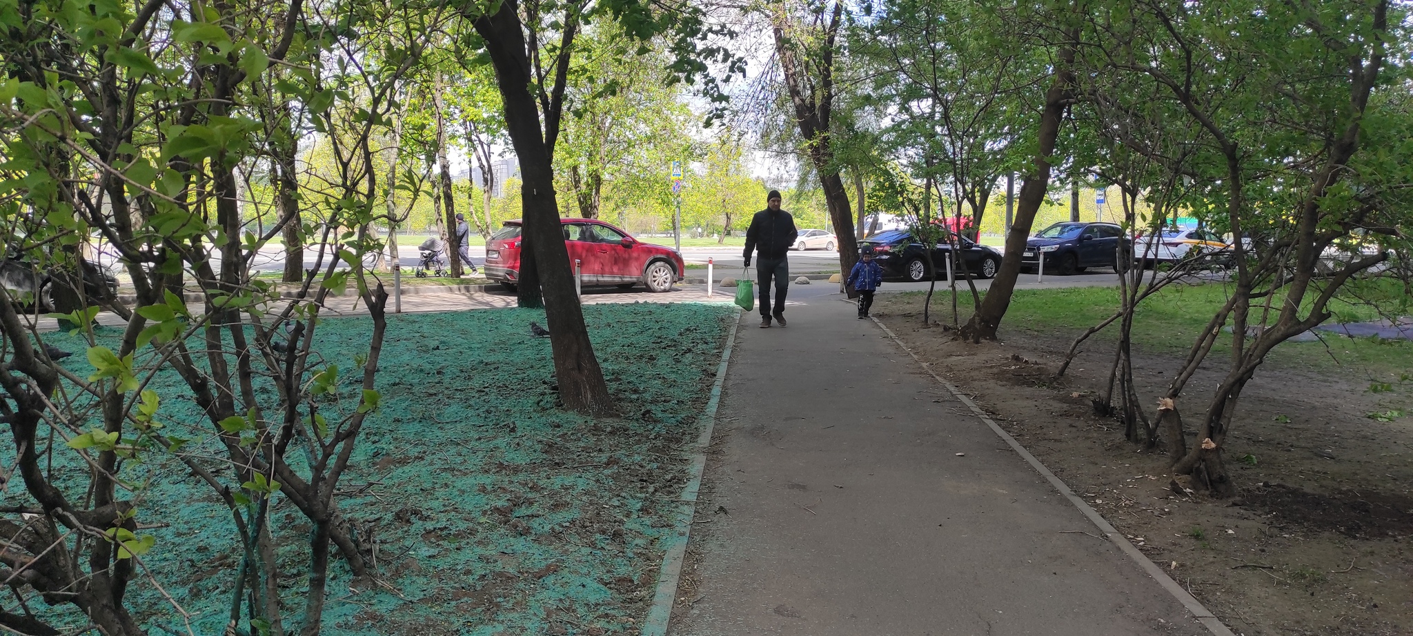В преддверии праздника вместо того чтобы посеять траву, все прогалины там, где в прошлые годы был уложен рулонный газон и не прижился, землю тупо покрасили зелёной краской (чем-то зелёным?). По крайней мере это смотрится именно так. И это по всему району.