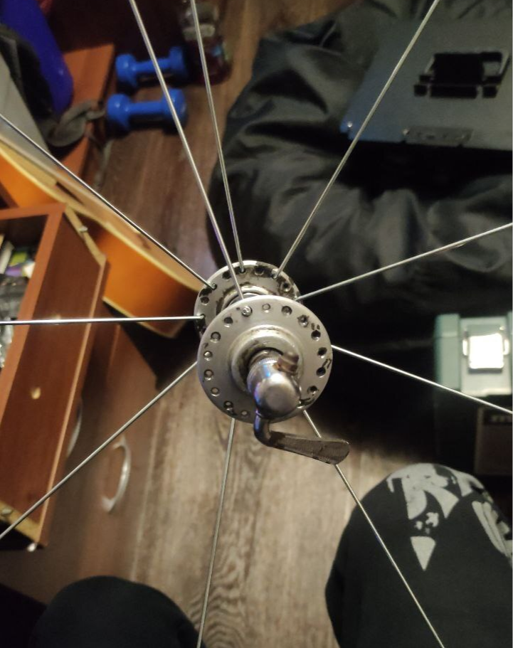 Параллельно с этим я подготавливал втулки к спицеванию сначала надо было избавиться от старых ободов и так как с собой у меня нечего кроме плоскогубцев не было, было принято волевое решения просто перекусить все спицы