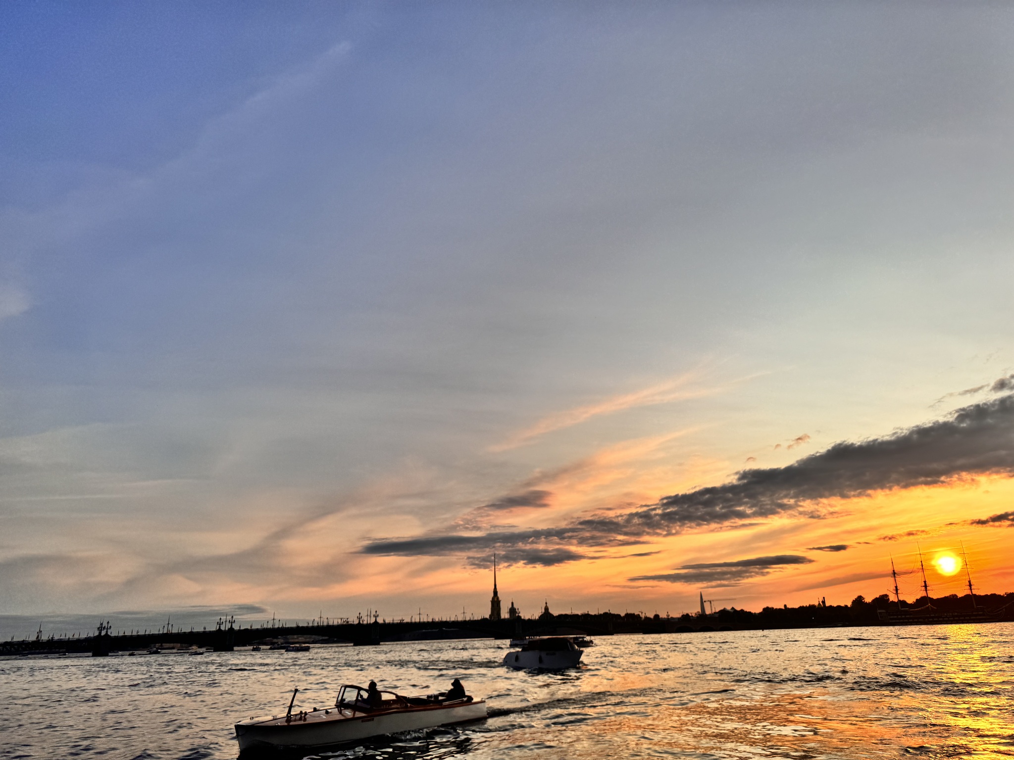 Кораблик ночью - 1300. Не поплыли, хотелось спать. Невозможно сутки гулять, ходить, а потом еще не спать и смотреть на мосты. Это из отдыха превращается в пытку.