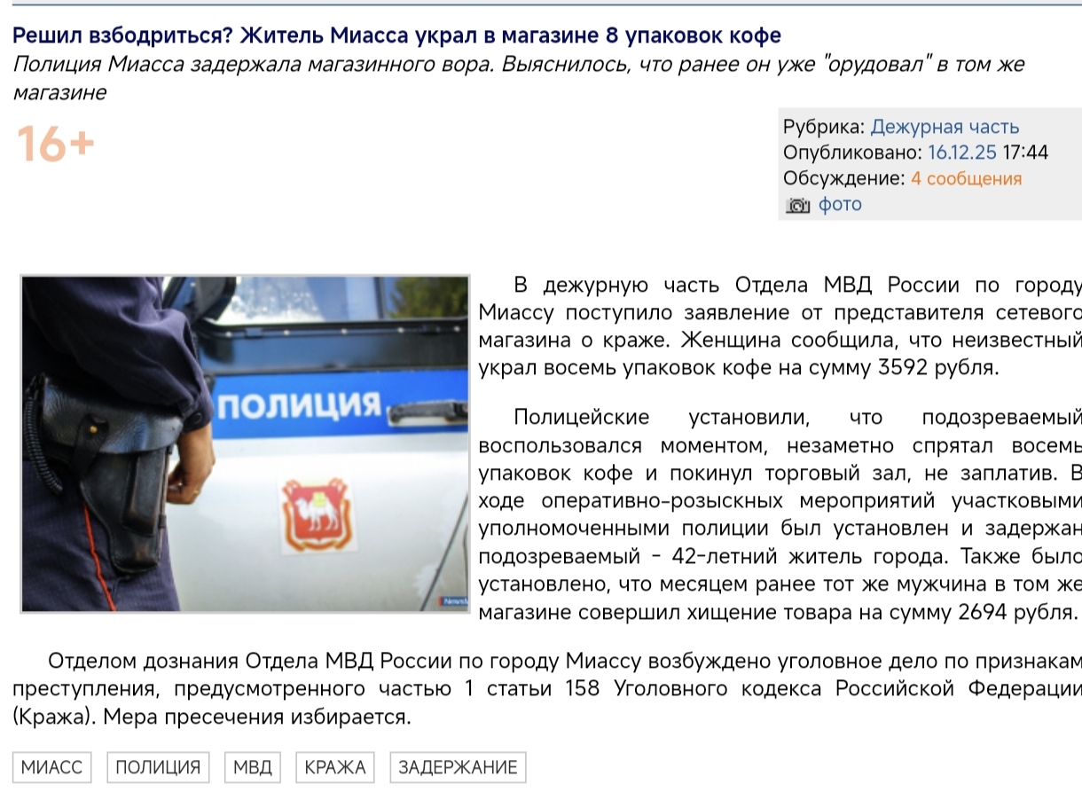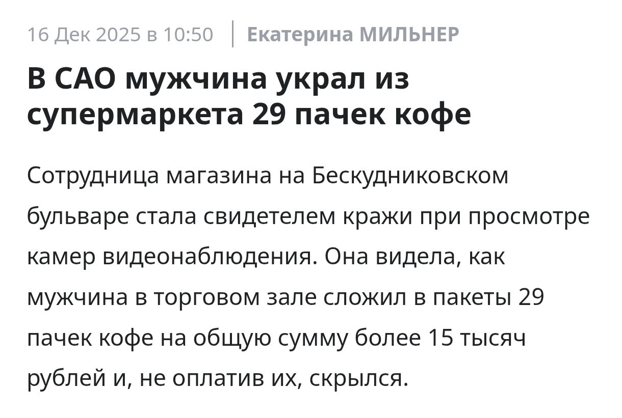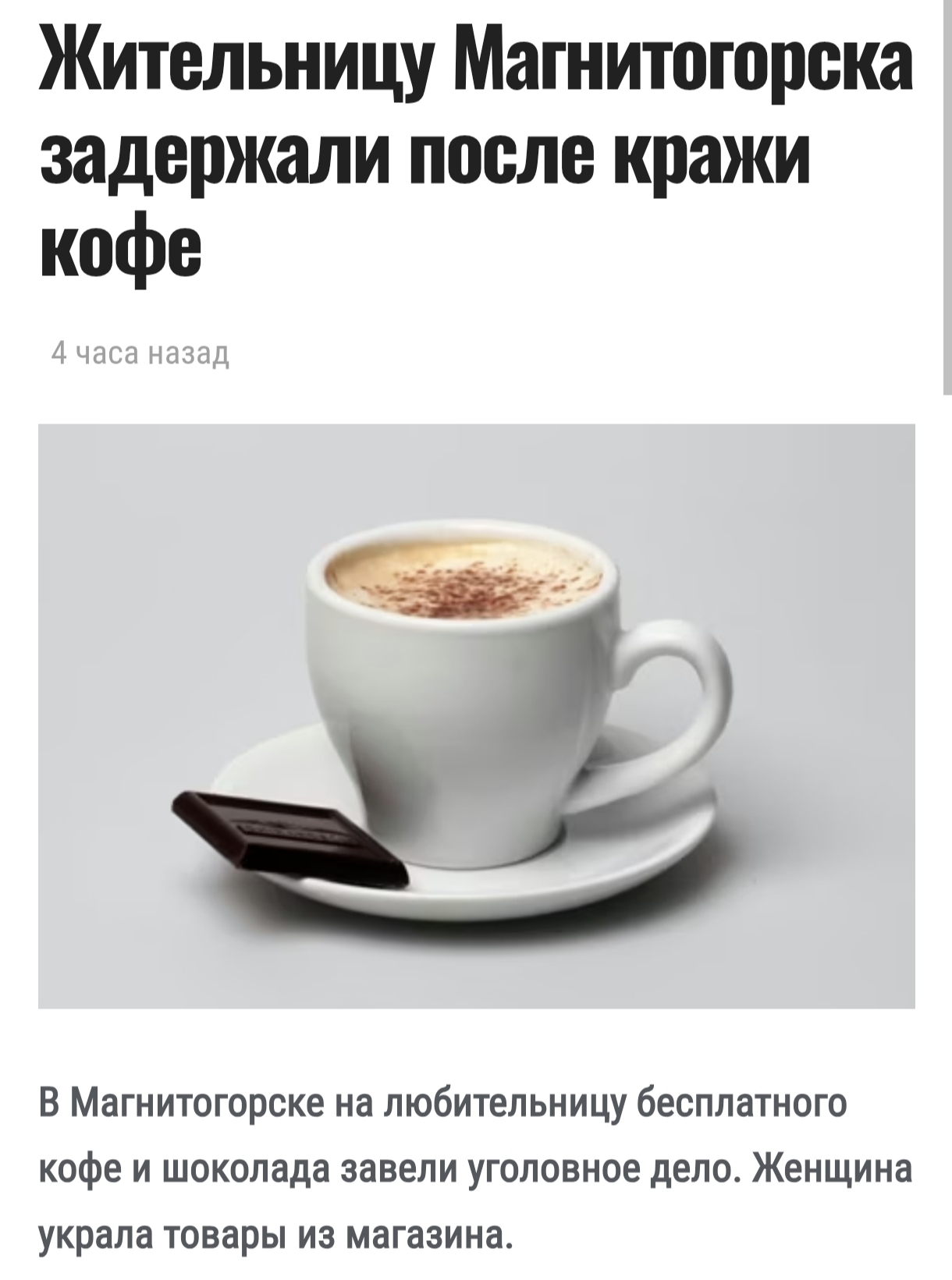 12 Cheshire93 Кофе мой друг Я конечно понимаю, что кофе дорожает, но 1 месяц назад не знал, что все настолько плохо. Как-то кучно пошли) Миасс: https://newsmiass.ru/index.php?news=82075Курск:https://kursk-izvestia.ru/news/1927799/Калуга:https://www.kp40.ru/news/crime/136812/Магнитогорск:https://www.google.com/amp/s/mr-info.ru/311268-zhitelnitsu-m...Москва:https://nashehovrino.ru/v-sao-muzhchina-ukral-iz-supermarket... Кофе Криминал Новости Магазин Длиннопост 1 Ещё 0