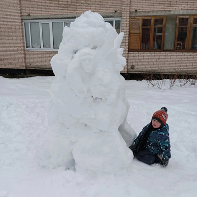 2020. Я новоиспеченная мать с мужем, который постоянно в командировках.. Я в ауте, но снеговик - дело святое. Дворник накидал кучку снега, когда чистил дорожку нашей аллеи, я сбегала в машину за лопатой и быстро скучила кучу побольше, а дальше получилось то, на что эта куча была похожа больше всего, на мой взгляд