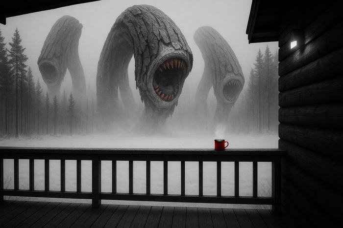 К полудню у тишины появился пульс. Снег падал строго вертикально, без ветра, накапливался на террасе равномерно, словно его туда укладывали. Ночью печь снова дала сбой, выплюнув дым в комнату. Я открыл дверь проветрить — и застыл.