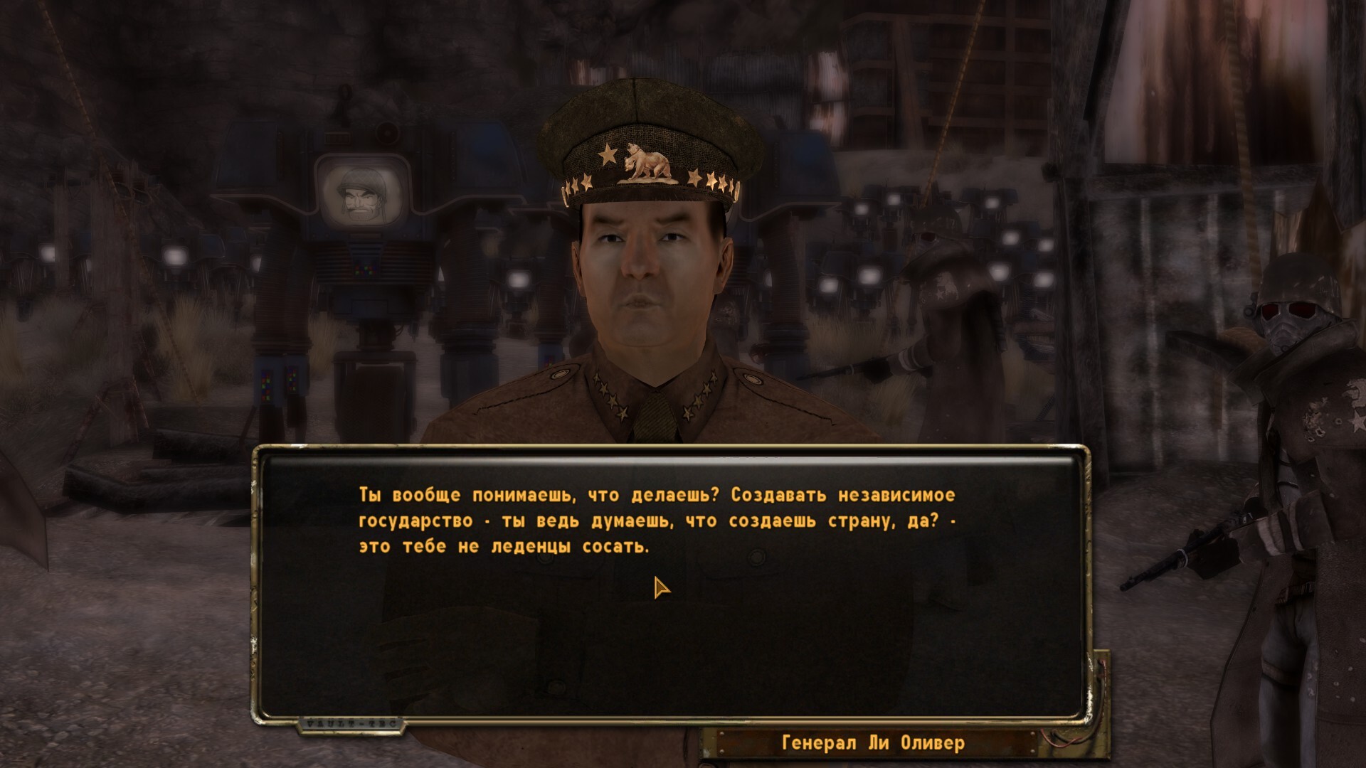 Братство Стали: помог ему снять изоляцию и заключить мир с НКР. Пограничные конфликты между Республикой и Братством в перспективе не нужны, да и Братья могут быть полезны в восстановлении пустошей или хотя бы в техобслуживании того, что ещё не развалилось. До Вероники же дошло что нужно эволюционировать, и до них дойдёт.