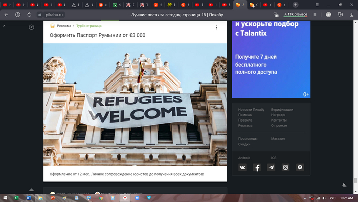 0 DELETED Политика Я никогда не думал, что я румын, но спасибо 3 года назад Пришла вот такая реклама на пикабу, насколько помню, это яндекс делает здесь рекламу, сижу немножечко в шоке. Я так понимаю, те, кто хотел в европу, теперь точно станут европейцами. Реклама Пикабу Яндекс Украина Политика Ещё 0