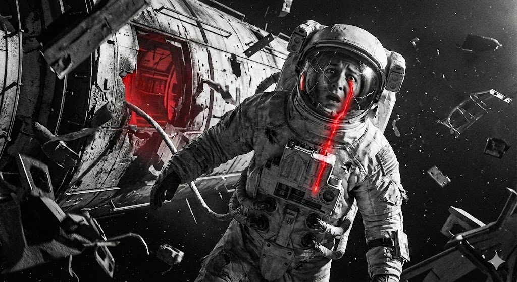 Тень на мгновение скользит на фоне далеких огней. Неправильная форма. Готов поклясться, что оно похоже на человека, но все в нем... искажено. Просто тело, без деталей. Ни скафандра. Ни троса. Оно движется неестественно, дергано, словно бумажный змей, подхваченный невозможным ветром, без всякой логики и ритма. Его неестественно длинные, вытянутые руки — будто их вывернуло при взрывной декомпрессии — тянутся ко мне, распластываясь в пространстве. От этого зрелища меня пробирает ледяной ужас.