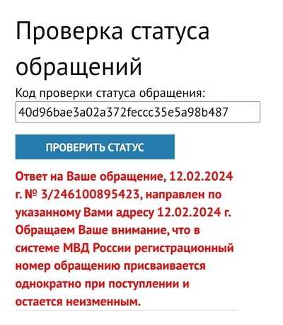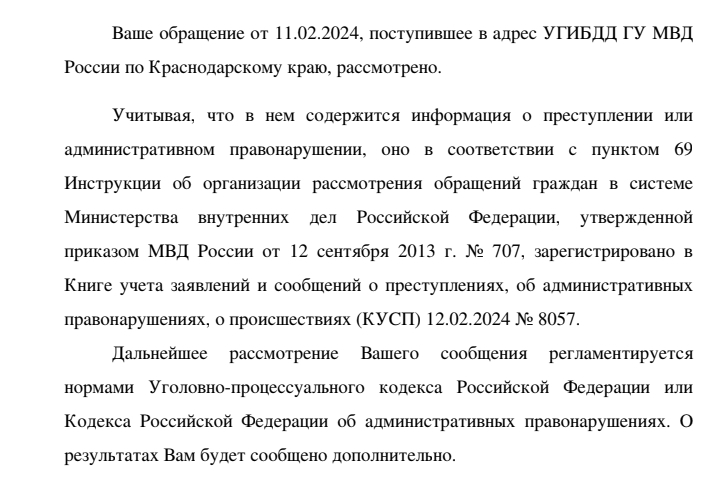 Учитывая, что в нем содержится информация о преступлении или административном правонарушении, оно в соответствии с пунктом 69 Инструкции об организации рассмотрения обращений граждан в системе Министерства внутренних дел Российской Федерации, утвержденной приказом МВД России от 12 сентября 2013 г. No 707, зарегистрировано в Книге учета заявлений и сообщений о преступлениях, об административных правонарушениях, о происшествиях (КУСП) 12.02.2024 No 8057.