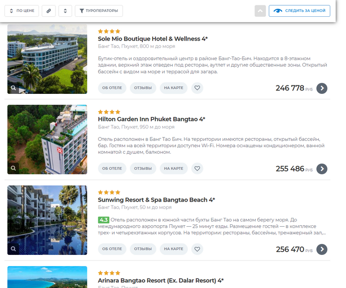 Туры можно искать на сайтах-агрегаторах, там собирают предложения от разных туроператоров. Я, например, смотрю на Турвизоре — они показывают сразу финальную цену со всеми сборами, а не как обычно: сначала одна цена, потом еще доплаты, топливные сборы и внезапные комиссии. Удобно, что можно подписаться на цену — сайт сообщает, если тур, который присмотрели, подешевеет.
