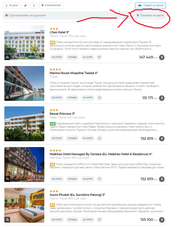 Если все-таки смотрите отели, то можно глянуть на Турвизоре. Отмечаете область на карте, где хотите жить и смотрите список, фильтруете по цене и рейтингу: