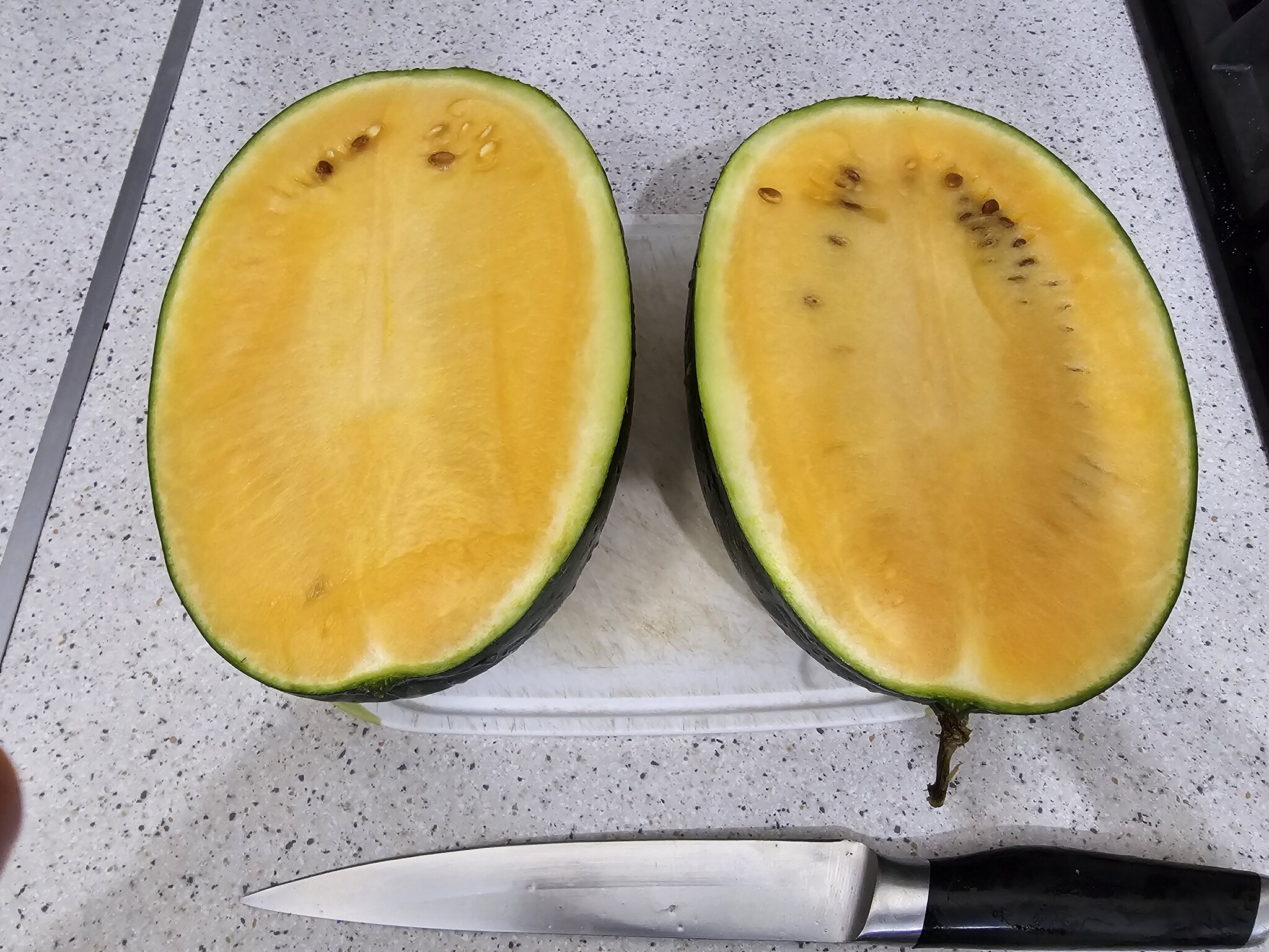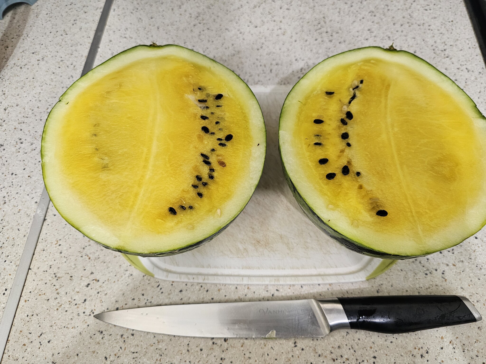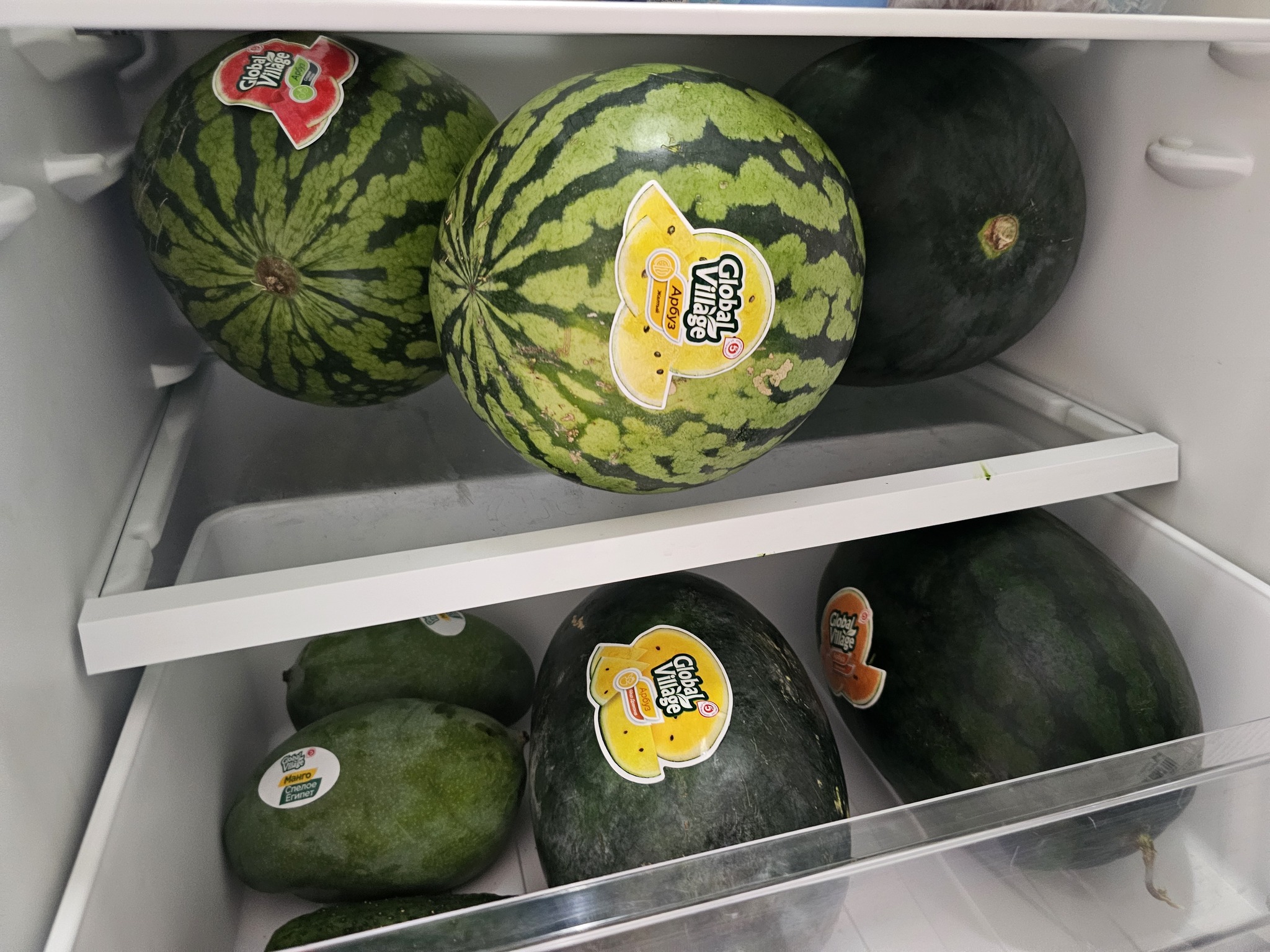 Первым было решено съесть "оранжевый свежий" и это был самый невкусный арбуз. Точнее, он был вообще безвкусным и с еле ощутимым запахом тыквы. Возможно, слово свежий в названии говорит о том, что он не спелый, но есть его было невозможно.