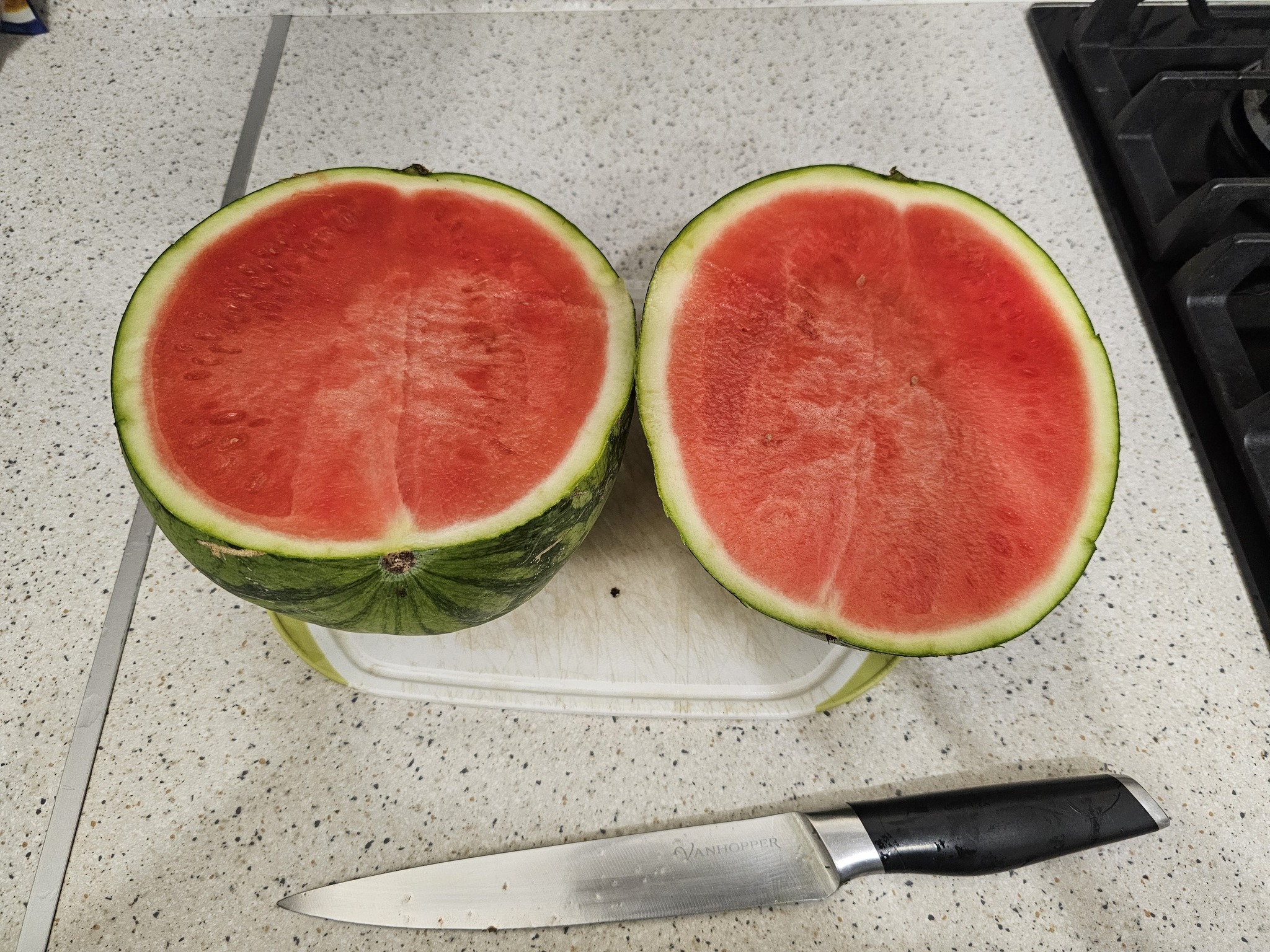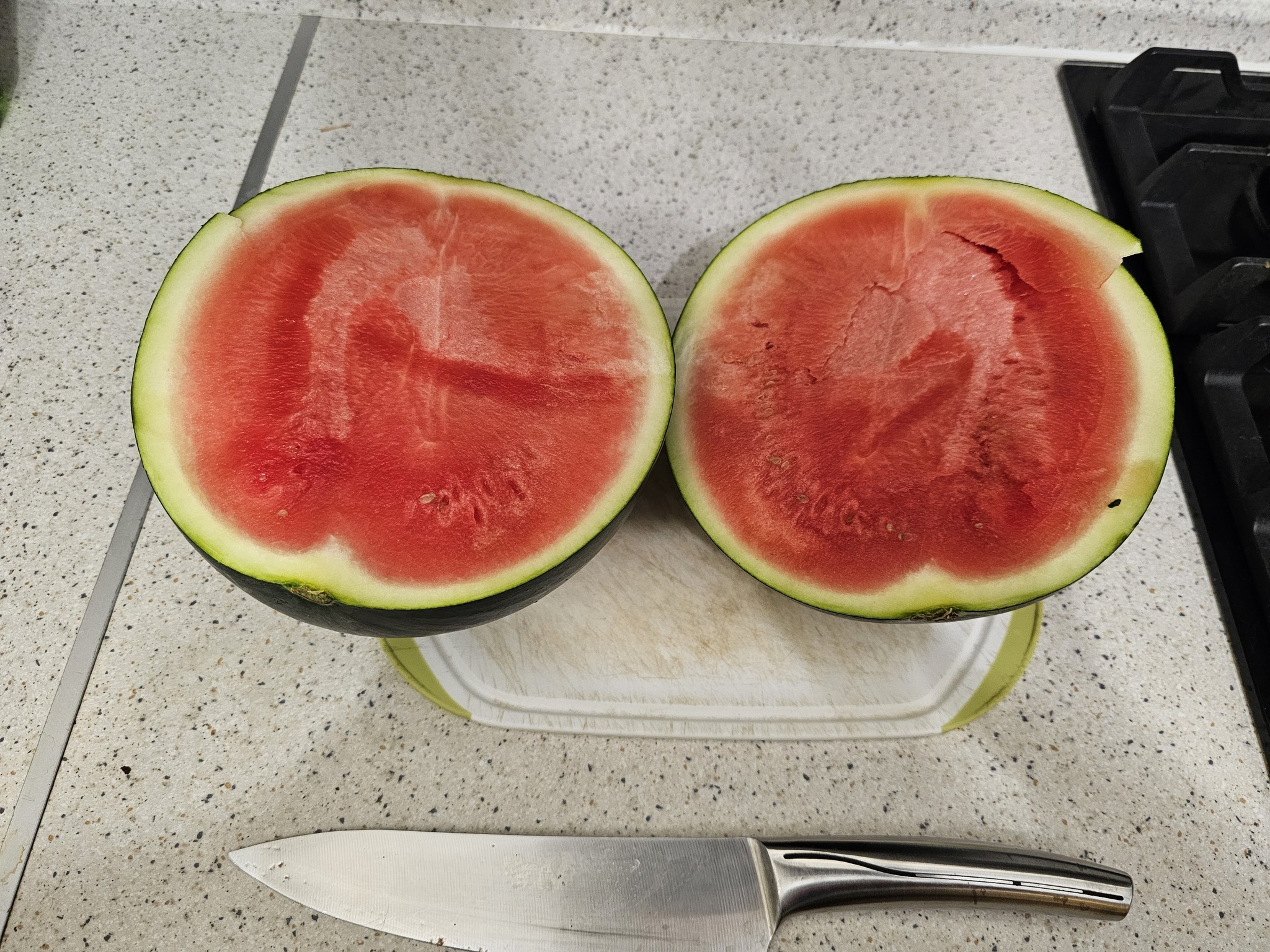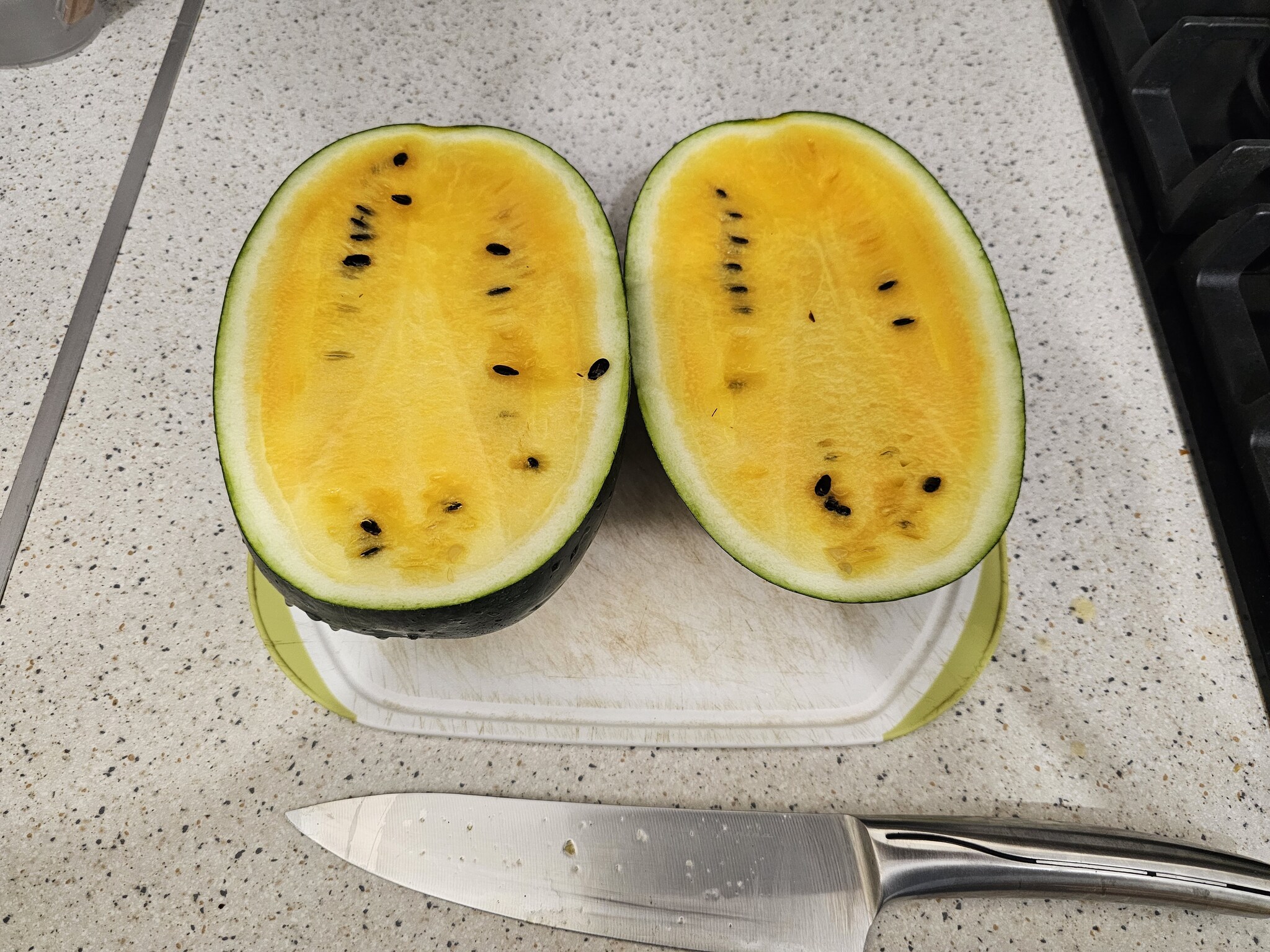 Первым было решено съесть "оранжевый свежий" и это был самый невкусный арбуз. Точнее, он был вообще безвкусным и с еле ощутимым запахом тыквы. Возможно, слово свежий в названии говорит о том, что он не спелый, но есть его было невозможно.