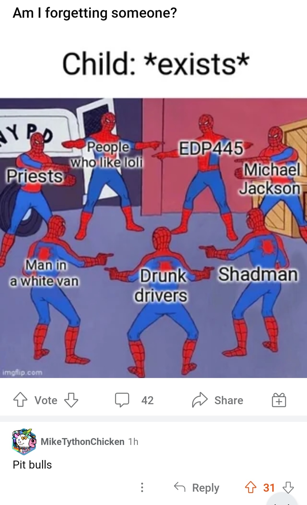 Дети: существуют Священники, Лоликонщики, Майкл Джексон, мужчина в белом фургон, пьяные водители, шедман(и кто такое EDP445?) Автор поста: я кого-то забыл? Комментарий: "Пит були"