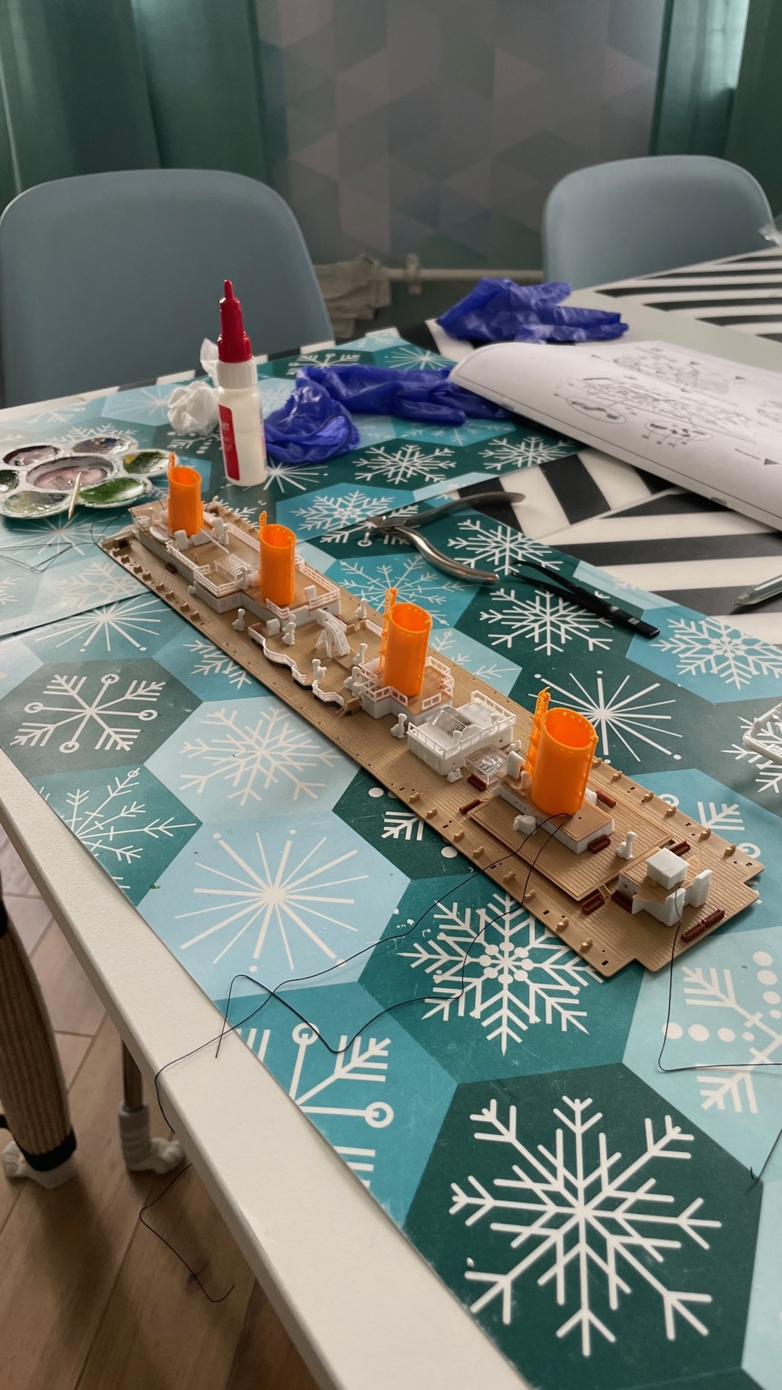 Частично собрала нос корабля. Поначалу было сложно приклеивать маленькие детали, руки тряслись и черные колыбашки все время выпадали из пинцета, но потом приноровилась.