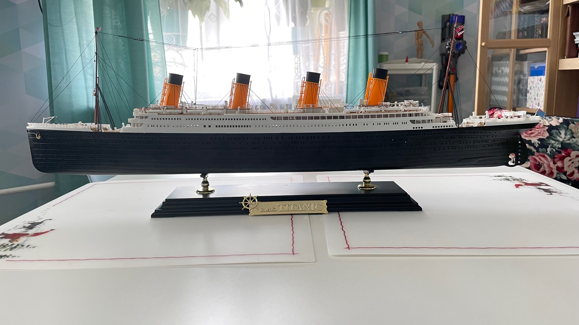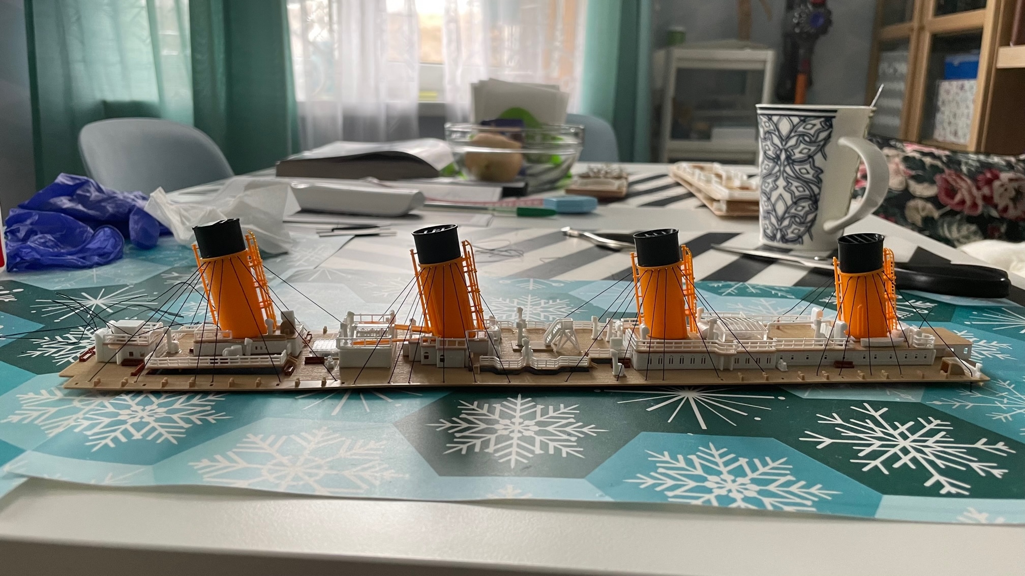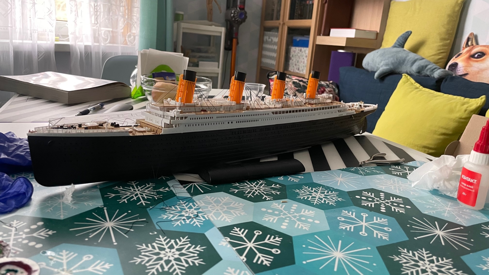 В итоге, получилось вот такое вот творение (только сейчас заметила, что забыла приклеить винты). Повторюсь- ватерлинию я покрашу, когда краску куплю. "Почему нельзя было сразу покрасить, а уж потом выставлять на Пикабу?"- да потому, что хрен знает, когда я сподоблюсь на это, а похвастаться уже хочется, точнее сказать, что даже такой рукожоп как я, может собрать такую модель.