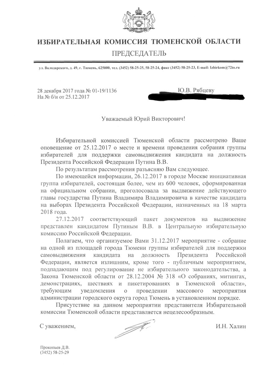 Облизбирком 28 декабря прислал ответ на оповещение: организуемое собрание, по его мнению — «излишнее», поскольку «по имеющимся сведениям, 26 декабря в Москве инициативная группа проголосовала за выдвижение В.В Путина в качестве кандидата на выборах Президента РФ».