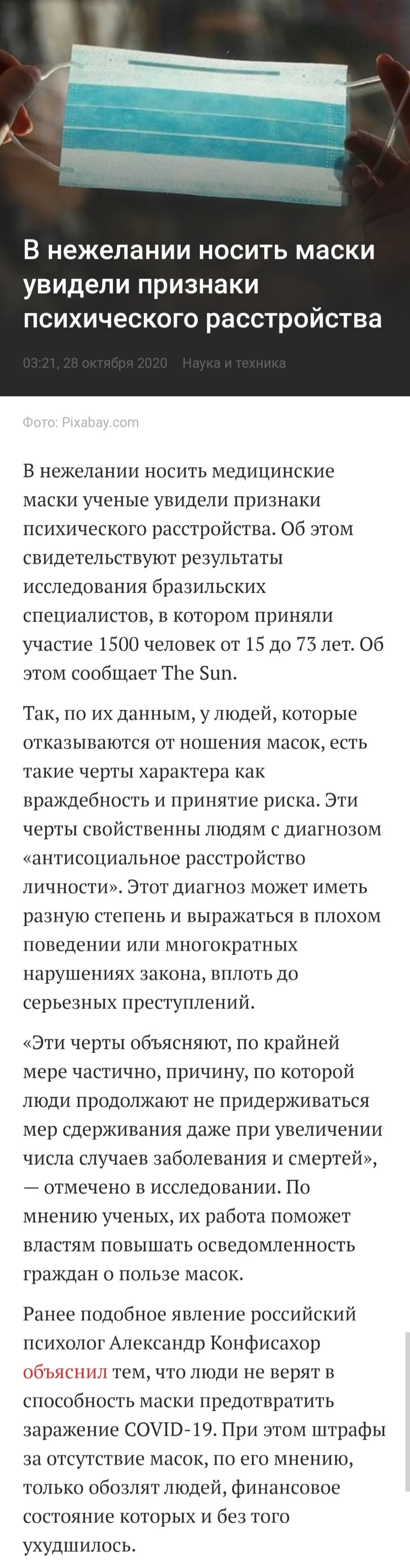 30 Kuchka70 Я примерно так и думал... 5 лет назад Истточник: https://m.lenta.ru/news/2020/10/28/antisocial/ Маска Средства защиты Исследования Антисоциальность Психическое расстройство Lenta ru Длиннопост Ещё 0