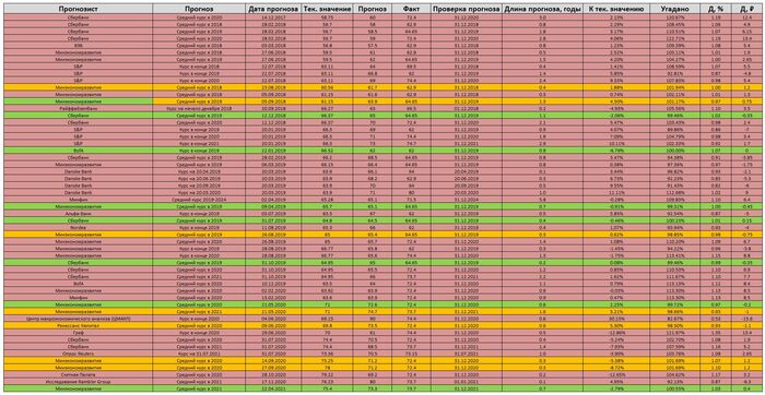 Как правило, все прогнозы даются либо на среднегодовой курс (так делают российские структуры), либо предсказывается курс на определенную дату (так часто делают наши "западные партнеры"). В случае со среднегодовым курсом я записывал в табличку среднегодовой курс на момент представления прогноза, в случае с курсом на дату, я записывал в табличку текущий курс валюты. Это важно для дальнейшего понимания универсального метода прогнозирования этих экспертов в макроэкономике.