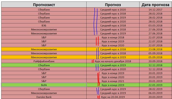Среди прогнозистов есть и иностранные исследователи: Bank of America, Standart & Poors, Danske Bank. Есть частные банки: Райффайзен, Нордеа, Альфа-Банк. Короче, всех понемногу.