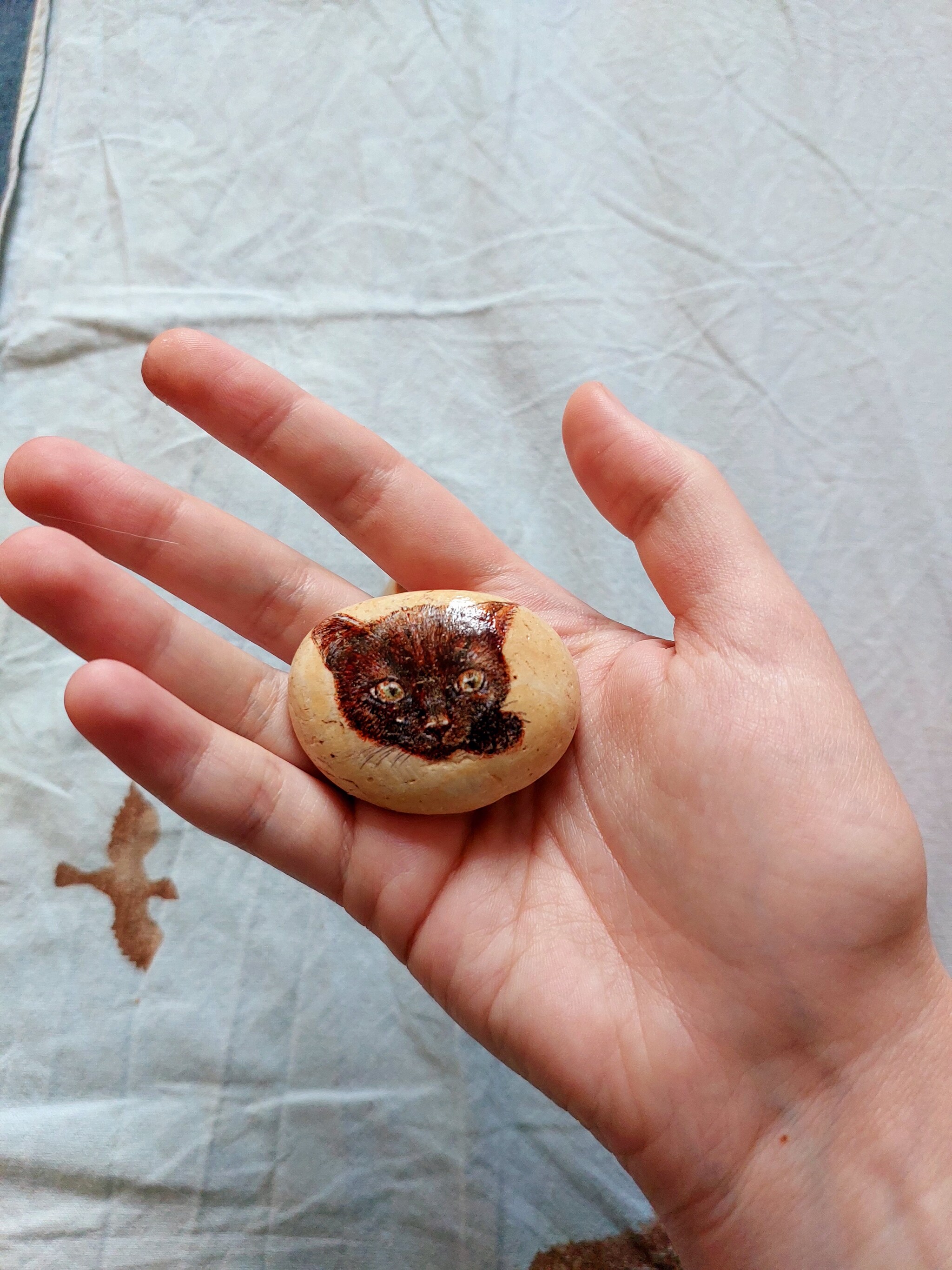 Котику досталась более пористая галька, в несколько мест стержень ручки не помещается, поэтому тут немного белых крапинок. Но он всё равно милый: