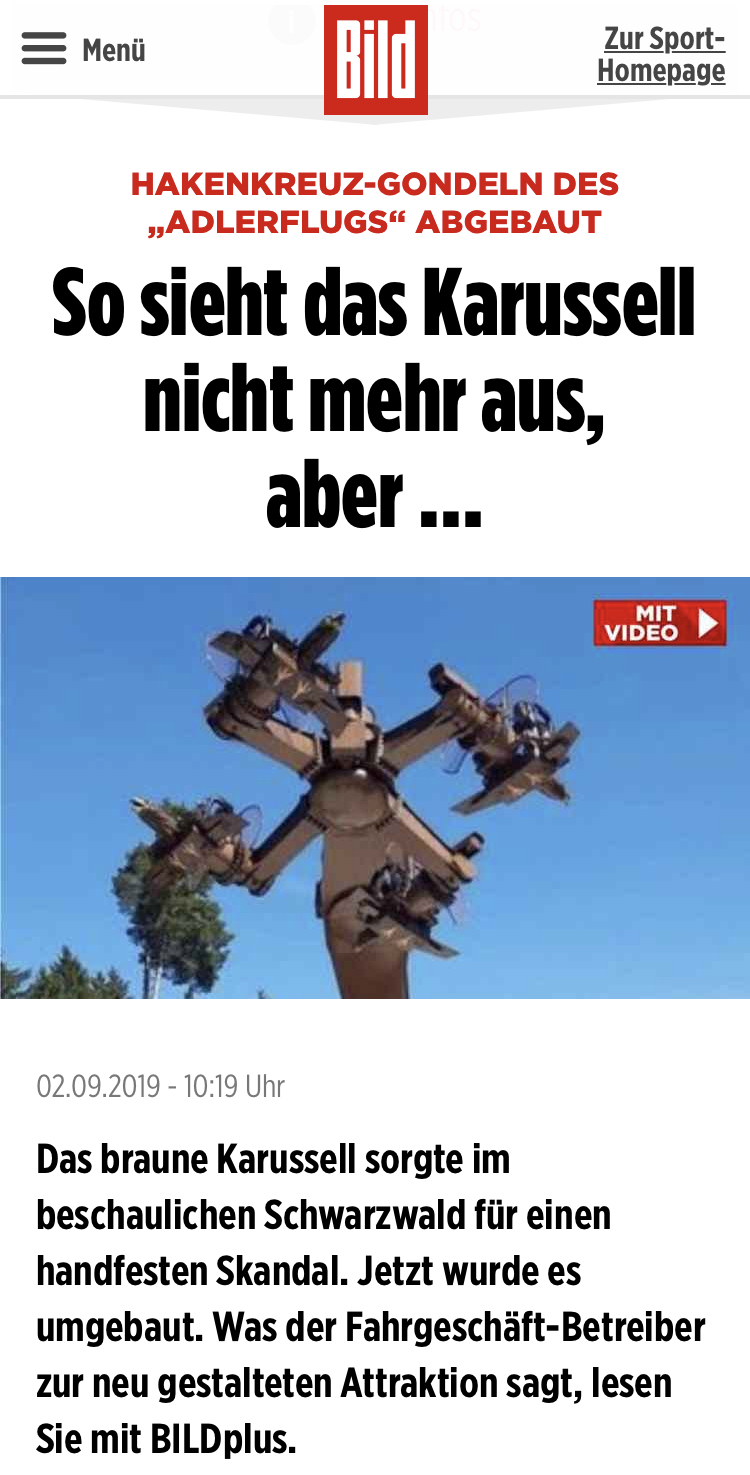Перевод текста: Коричневая карусель привела к чувствительному скандалу в доселе спокойном Шварцвальде. Теперь её переделали. Что сказал Изготовитель об обновлённом аттракционе, читайте подробнее в приложении БИЛЬДплюс.