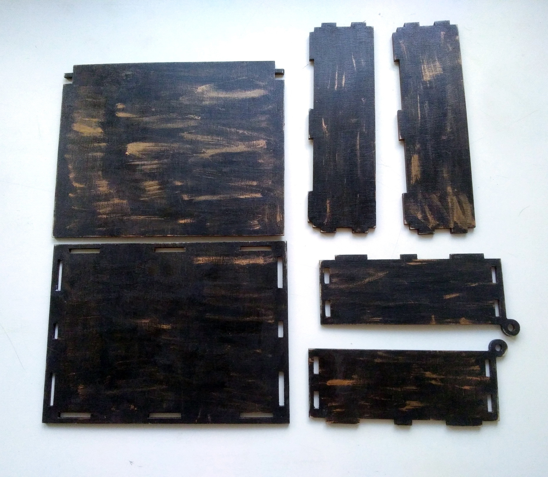 Дальше дело техники - каждую сторону коробочки почистила наждачкой и покрасила в черный цвет, а когда высохло - прошлась еще раз наждачкой, чтобы немного состарить и потрепать жизнью, потом прошлась сухой кистью, размазывая бронзу как бог на душу положит. Сразу скажу, что не пыталась имитировать древесину ценных пород или что-то такое, даже не аккуратничала, у меня была главная цель - приятно провести время. "Хуяк, хуяк - и в продакшн", это про меня, да.
