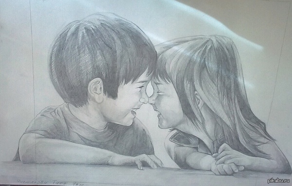 Не совсем удачная срисовка. У девочки длинная шея и что-то невнятное с правой рукой - совершенно непонятно, откуда растет. У мальчика тоже проблемы с плечами. Складки на одежде будто бы случайные. Однако, мне нравится штриховка. Удачи, автор, и да простишь ты меня за непрошенную критику ^^ Я помочь хочу - учтешь свои ошибки и твои следующие работы будут еще лучше :3