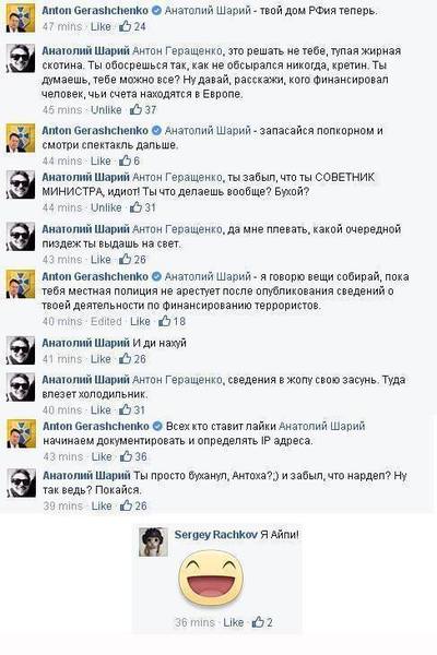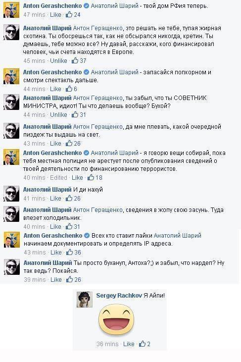 Геращенко:- я тя найду сцука!!!! Геращенко:- айпи вычеслю гомно ты!!! Шарий:- 89.178.90.125 Геращенко:- у меня прога сломалась, но я тя потом найду!!! Шарий:- ул. Братиславская 4, 38 Геращенко:- у меня машина не заводится, сам приезжай кусок гомна!!! хер я к те поеду!!! Геращенко:- чё зассал приехать пидр ты, я так и знал)))) Шарий:- давай адрес Геращенко:- иди на, я ща не дома Шарий:- а где? Геращенко:- в гостях, нас тут 8 человек приезжай бля!!!!! Шарий:- давай адрес Геращенко:- бля мы уезжаем Шарий:- куда? Геращенко:- (пользователь добавил вас в черный список)