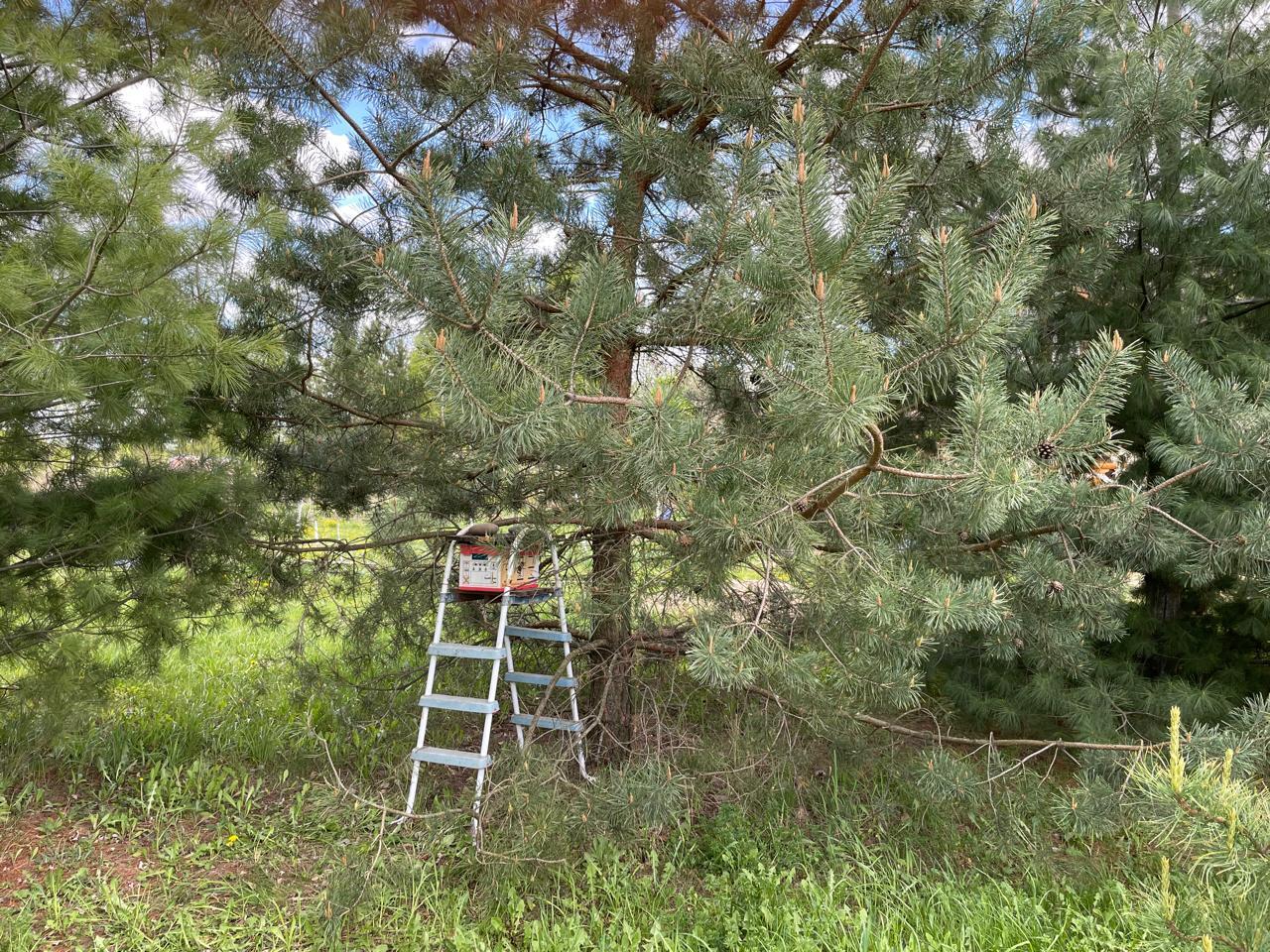 Улей рекомендуют размещать на высоте 1,0-1,5 м над землей. Я сначала хотел разместить где-нибудь на дереве, но потом решил поставить на старой стремянке от бассейна.