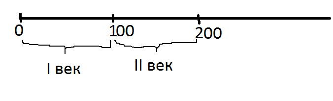 Когда мы разделили непрерывный отрезок на интервалы, мы получили возможность их посчитать. И, разумеется, мы про первый век (а он у нас от 0 до 100 года) говорим что он "первый", и называем его "I век". Неважно, что он начало берет в условном нуле, главное что он самый первый.