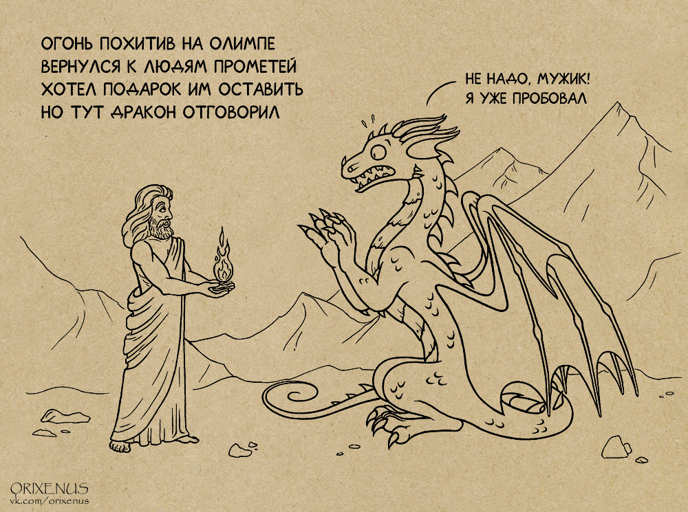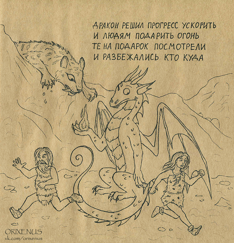 Спустя месяцы перерыва - очередная картинка про Прогрессивного дракона. Да, у него уже был опыт дарения огня людям - если кто забыл или не видел ту прошлую картинку, ниже будет повтор первой часть истории.