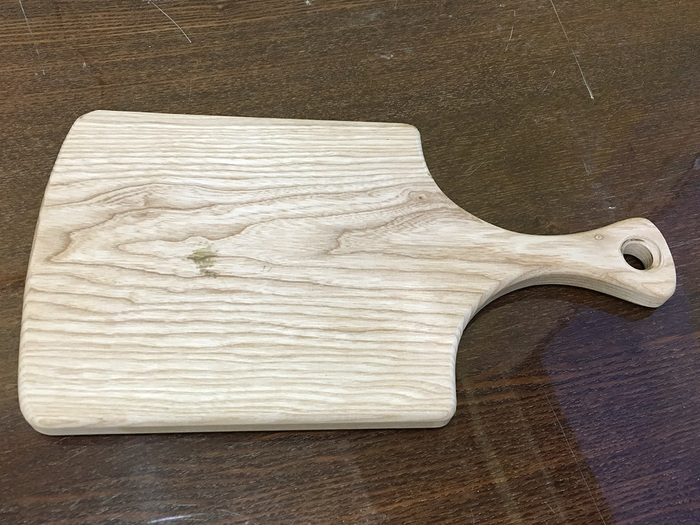 Имеем обычную разделочную доску из "дуба", который ясень. А к ней в комплекте отсутсвие параллельных или перпендикулярных линий, сучок, большая круглая фаска и ... бестолковая ручка с "дыркой"!