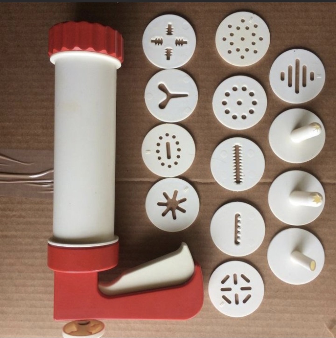 Еще помню стиральную машинку "Симбирка", как шланг то и дело выскакивал из тазика и происходил потоп). Там была хитрая система - после каждого цикла нужно было кидать шланг в унитаз и сливать воду. Потом выжимать бельё штуковиной с рукояткой, как в мясорубке. На обед мама делала жаренную картошку на говяжьем жире, пекла нам песочные печенья которые мы вместе творили вот с таким вот аппаратом вместе.