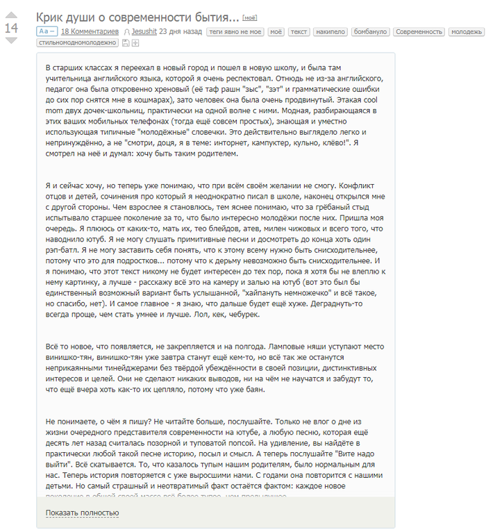Как я уже сказала ранее, это не первый случай. Но раньше я молчала, слушала людей, которые говорили мне "это интернет, тут нет ничего "своего", забей, и вообще, у тебя же не книгу украли, а какие-то посты, что тут такого". А вот много чего такого. Некрасиво так поступать, набирая плюсы чужим трудом и бегом баня настоящего автора, который в шоке увидел свой текст, изуродованный, с глупой отсебятиной, у кого-то под тегом "Мое". Нет, Jesushit, это не твое. Я за честный Пикабу.