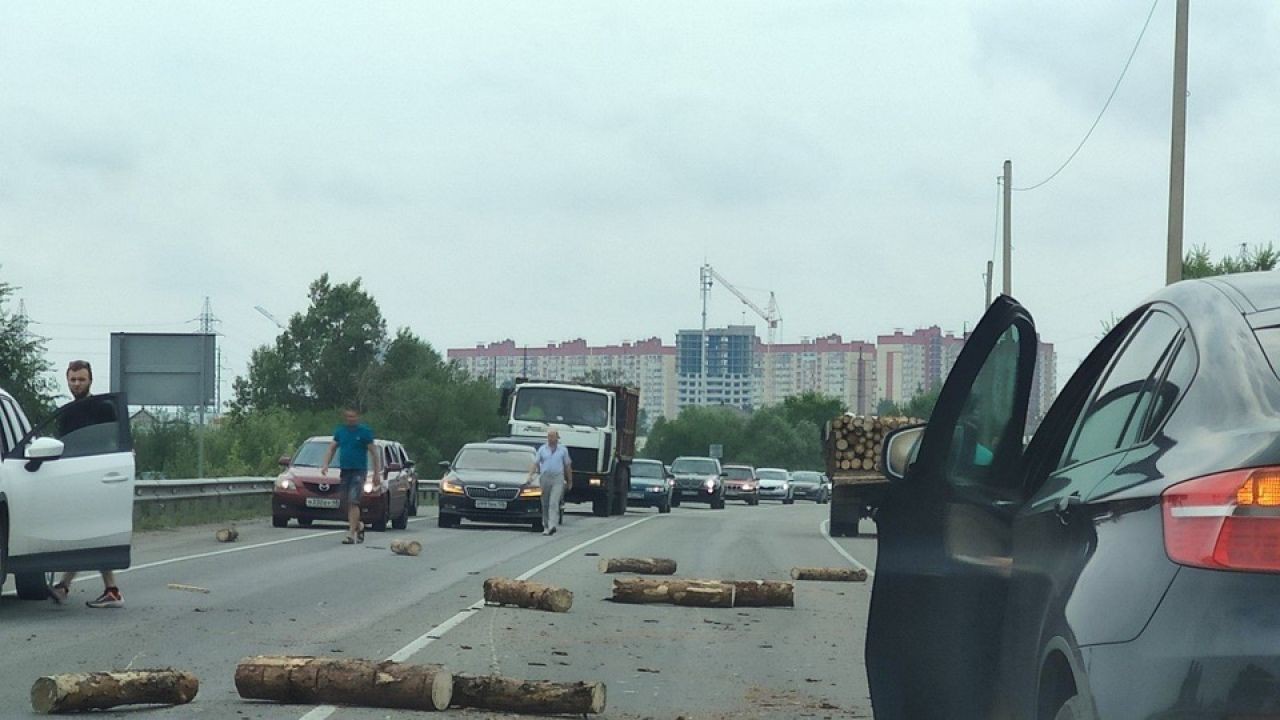 Судя по снимку, брёвна рассыпались на протяжении нескольких десятков метров. Водители отъехали к краям проезжей части, чтобы не повредить свои машины. На фотографии не видно, задел ли упавший груз какие-то авто. Зато просматривается сам кузов грузовика — брёвна лежат без какого-то крепления или укрытия.