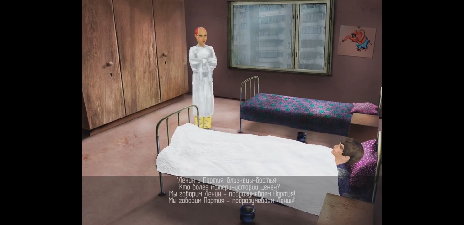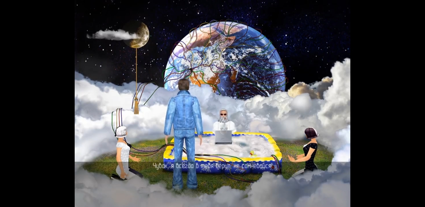 Кстати, у того кота, который всё время незаметно следил за персонажем, за Антоном, был голос Ельцина. Намёк, "Большой брат" следит за вами. Это президентские "игры".