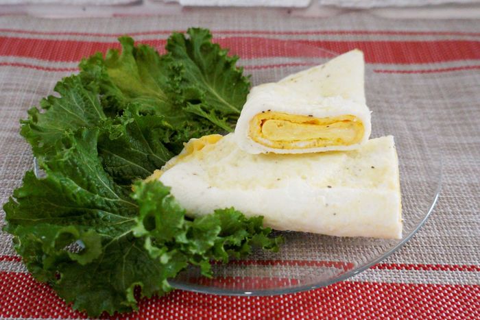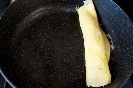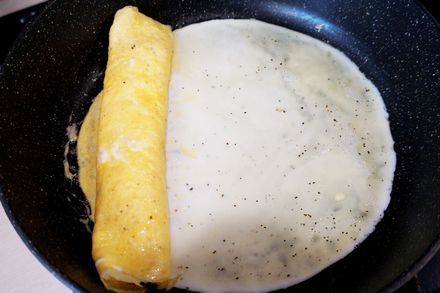 7. Аккуратно свернуть яичный блинчик с сыром в рулет и обжарить еще 1-2 минуты на медленном огне.