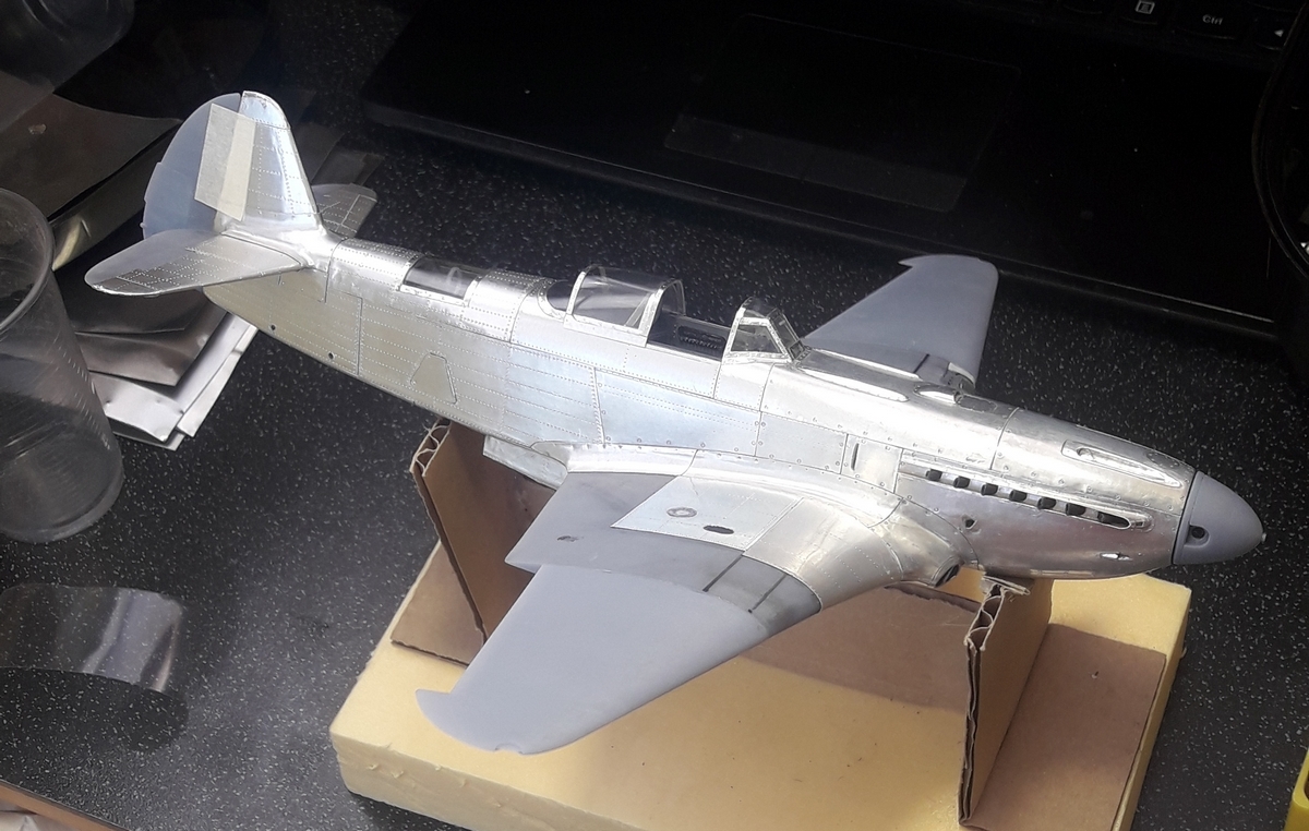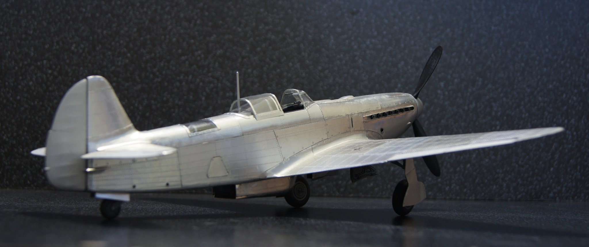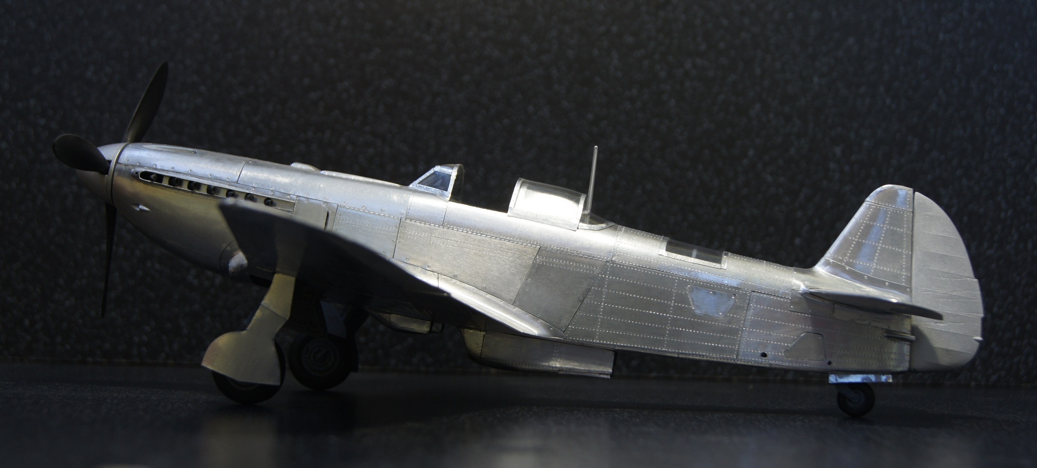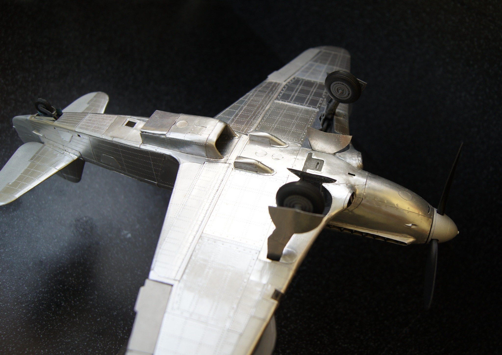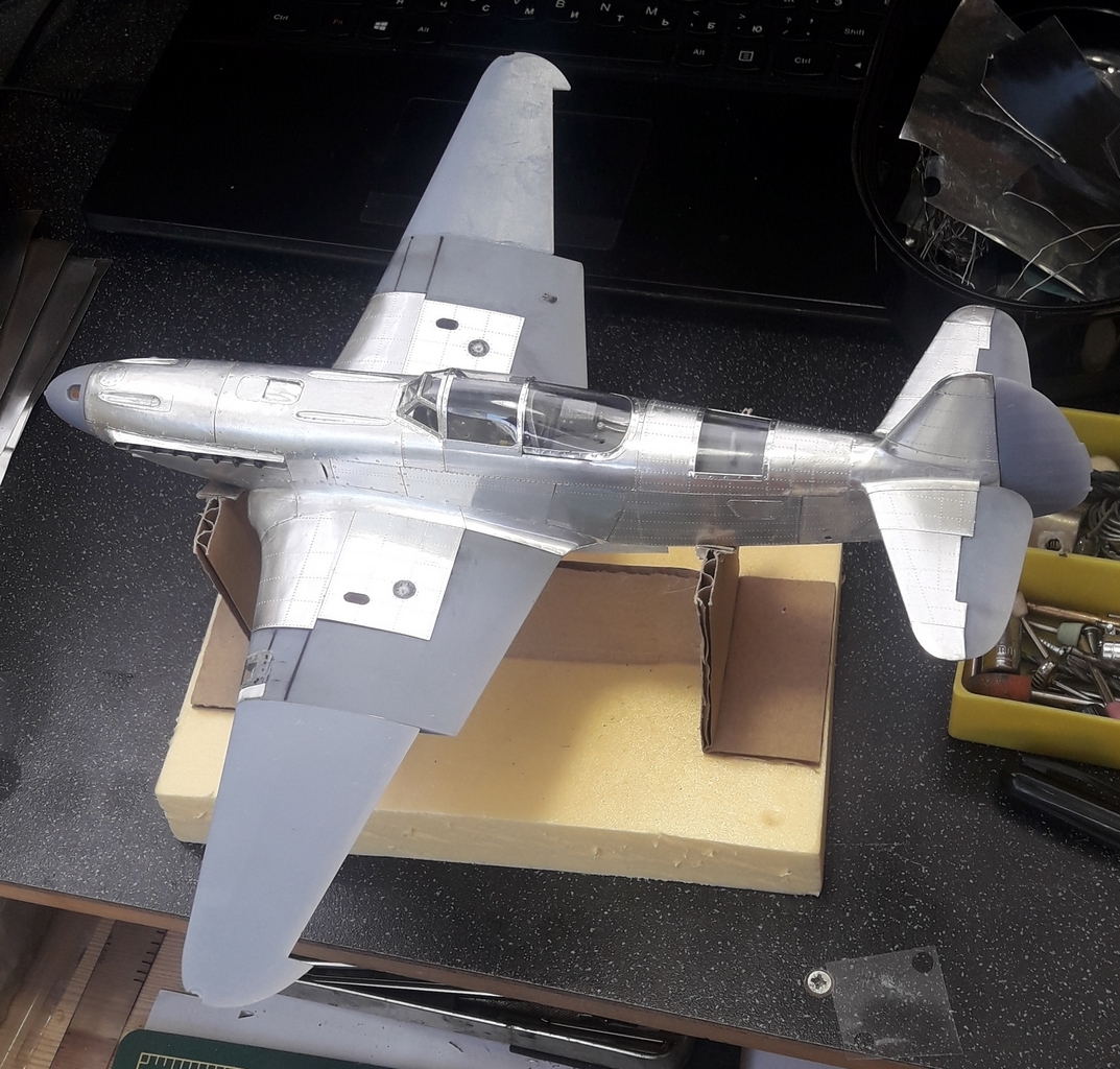 Моя недавняя и пока последняя в списке имеющихся модель с применением технологии оклейки листовым алюминием. Отличительной особенностью данной модели является полная замена наборного способа на фотополимерную 3D печать, что позволило сократить сроки на порядки. На эту модель чистого времени с начала проектировки 3D модели до последнего листа обшивки ушло около 4-х месяцев. Новые технологии позволили изготавливать матрицы и пуансоны для штамповки сложных деталей, а так же сделать рабочей сдвижную часть фонаря. Стойки шасси печатные с армированием точеной латунью и медиглами. Процесс постройки особо не снимал, некогда было. И еще в отличии от предыдущих двух моделей здесь были даны конкретные сроки на изготовление.