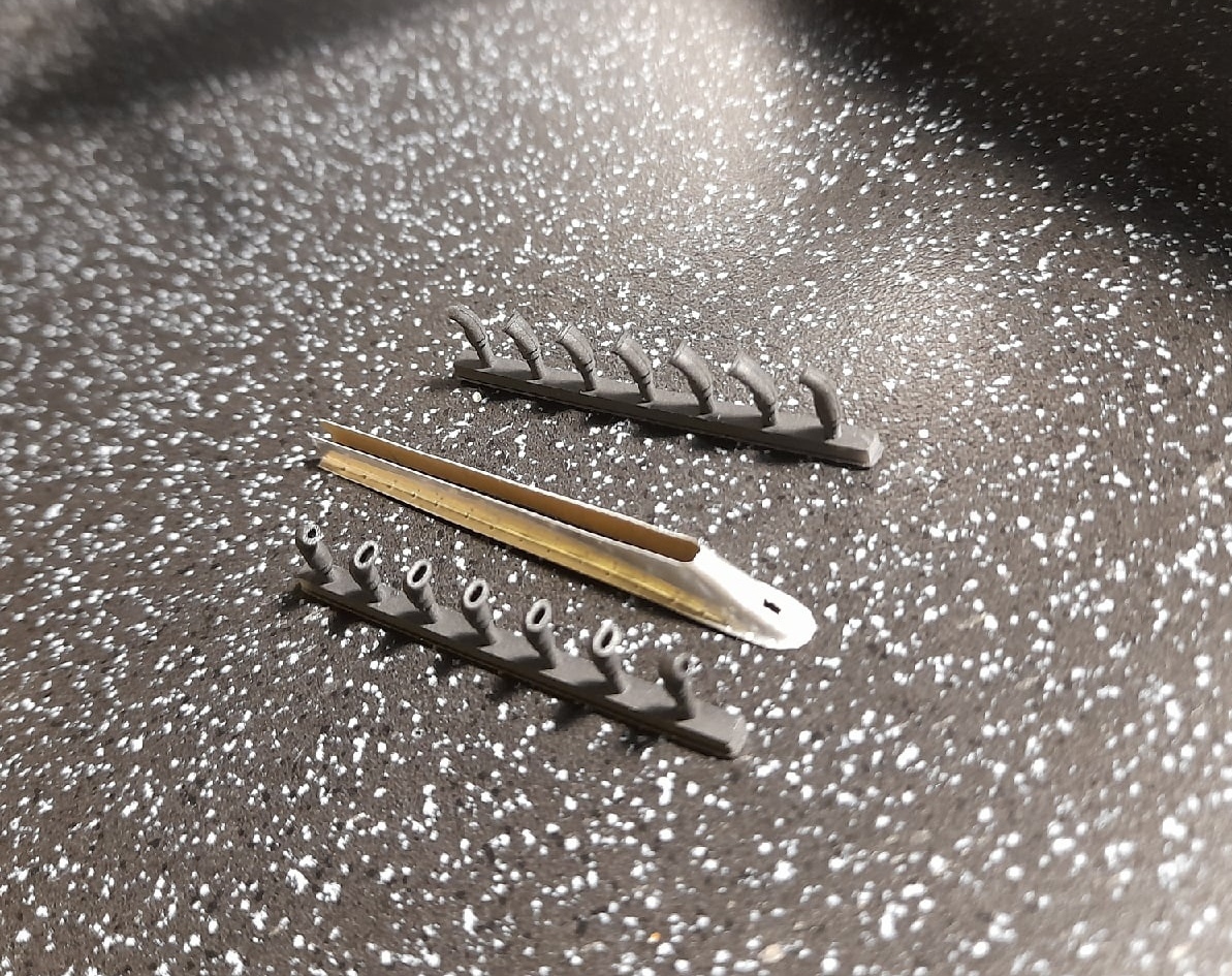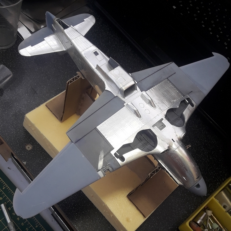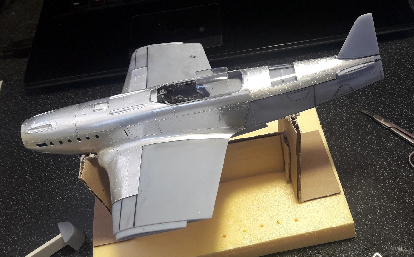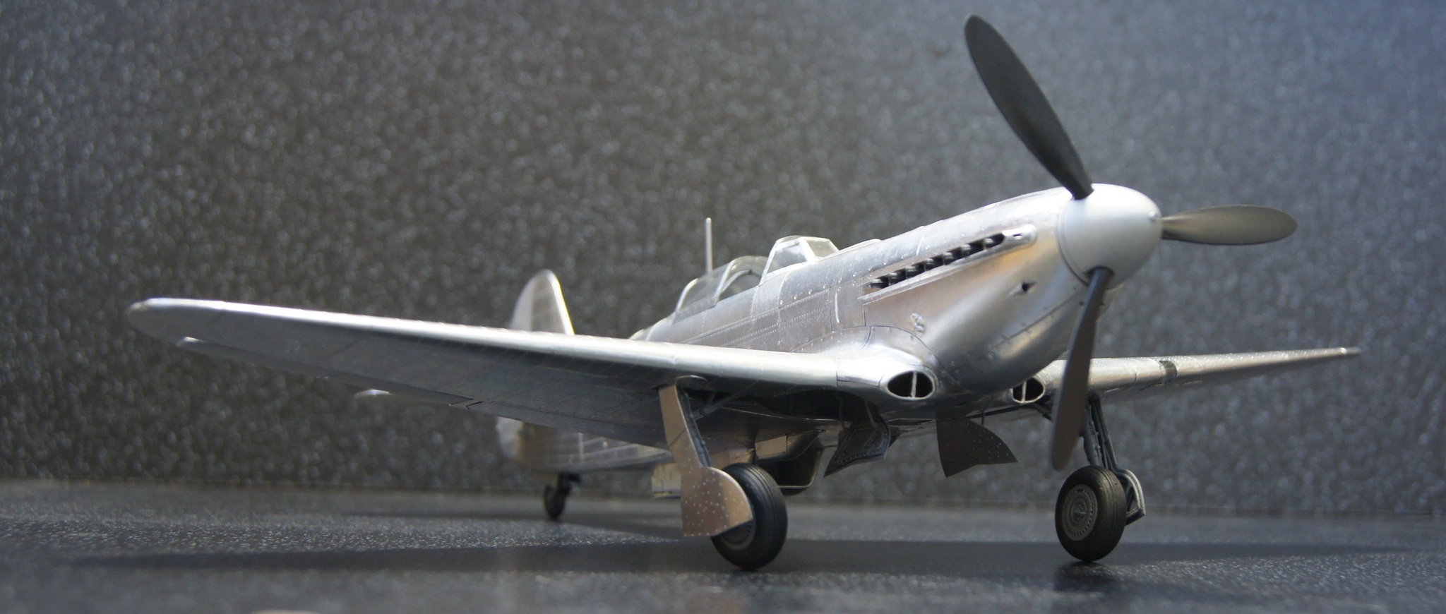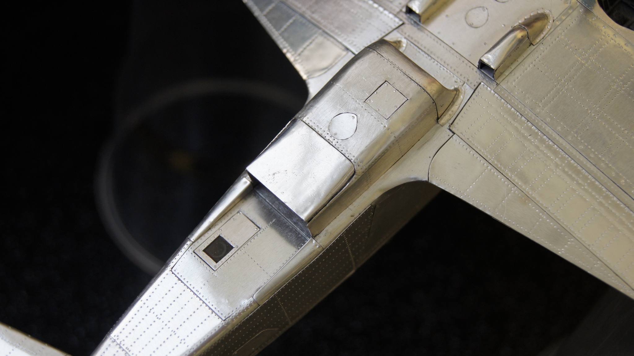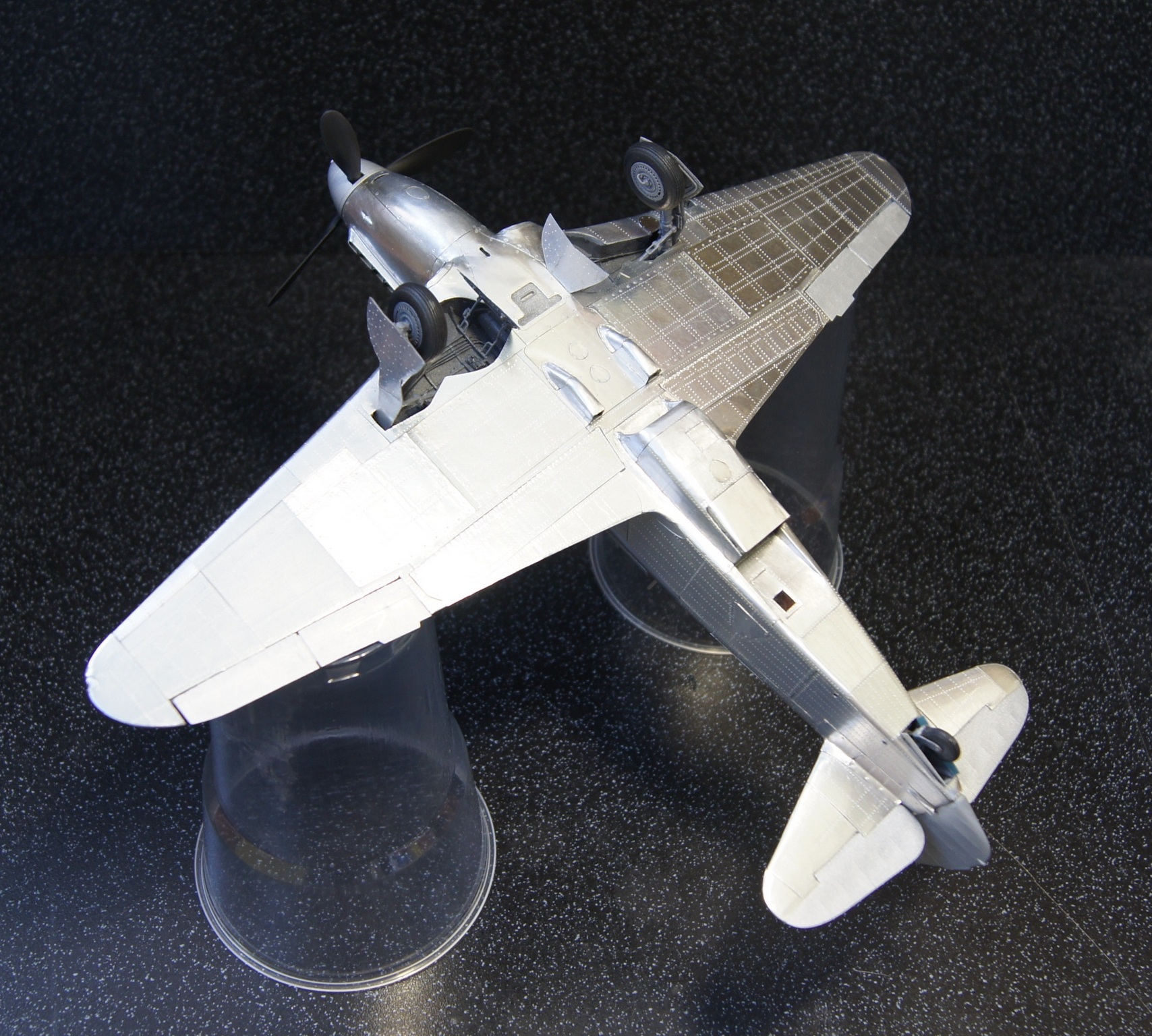 Моя недавняя и пока последняя в списке имеющихся модель с применением технологии оклейки листовым алюминием. Отличительной особенностью данной модели является полная замена наборного способа на фотополимерную 3D печать, что позволило сократить сроки на порядки. На эту модель чистого времени с начала проектировки 3D модели до последнего листа обшивки ушло около 4-х месяцев. Новые технологии позволили изготавливать матрицы и пуансоны для штамповки сложных деталей, а так же сделать рабочей сдвижную часть фонаря. Стойки шасси печатные с армированием точеной латунью и медиглами. Процесс постройки особо не снимал, некогда было. И еще в отличии от предыдущих двух моделей здесь были даны конкретные сроки на изготовление.