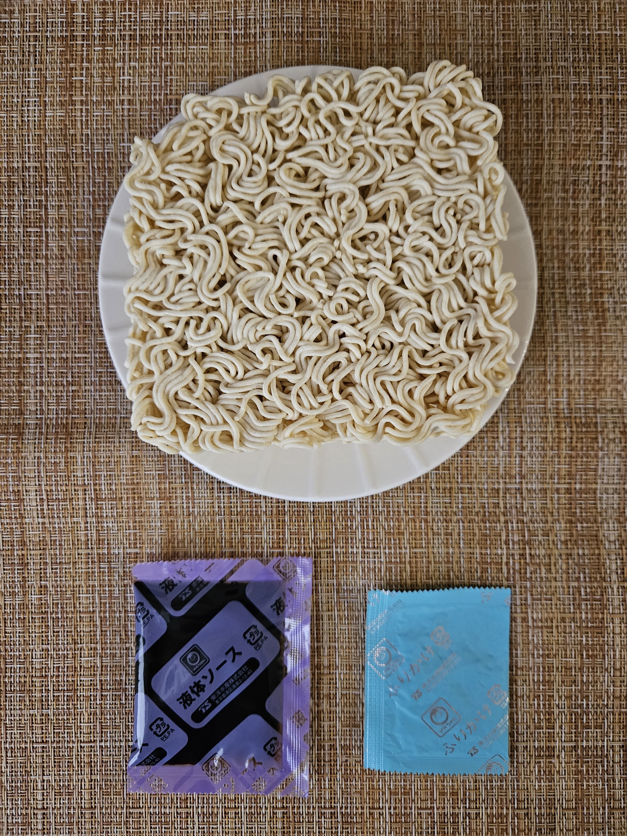 В лотке большой прямоугольный брикет лапши да пара маленьких пакетиков с добавками.