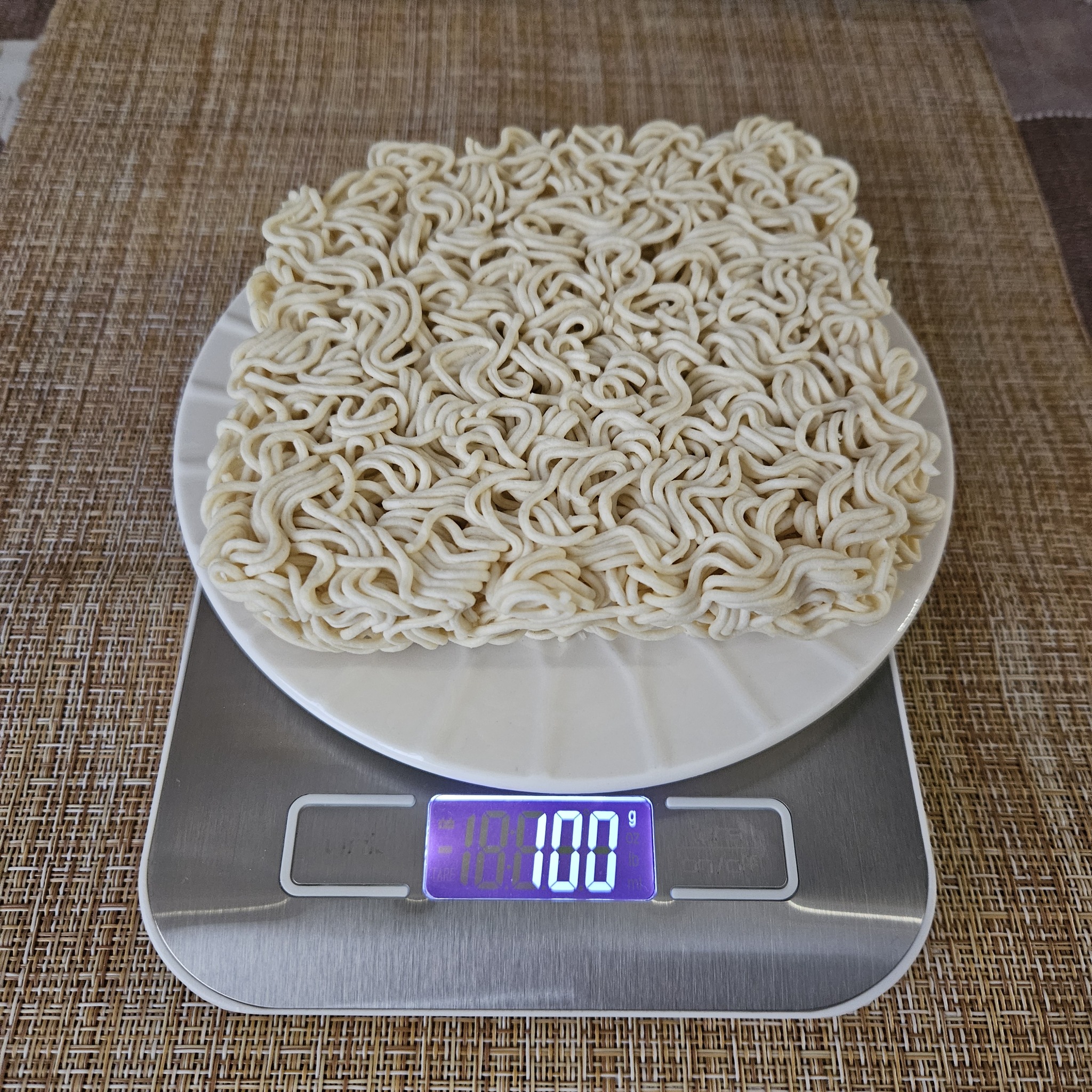 Лапша пшеничная, бледная, тоненькая. Вроде как должна пахнуть жареным, но не пахнет. Зато масса ровно 100 граммов.