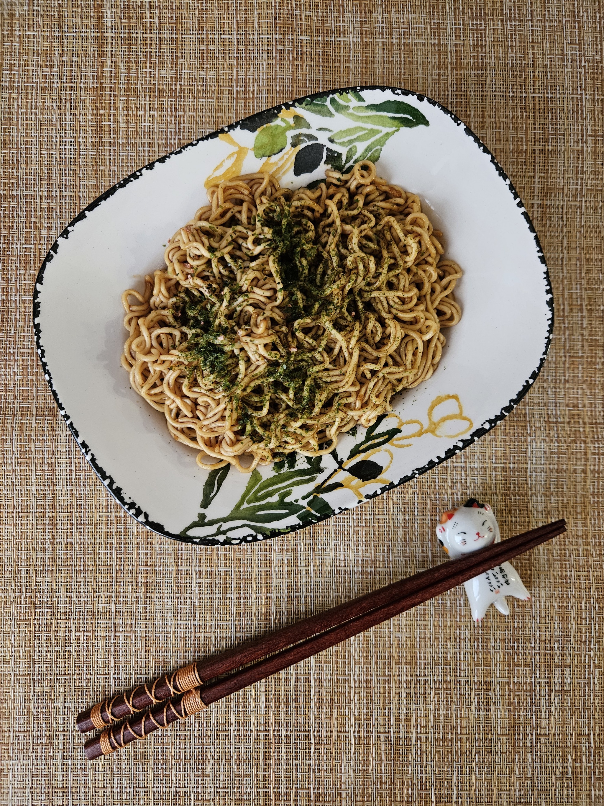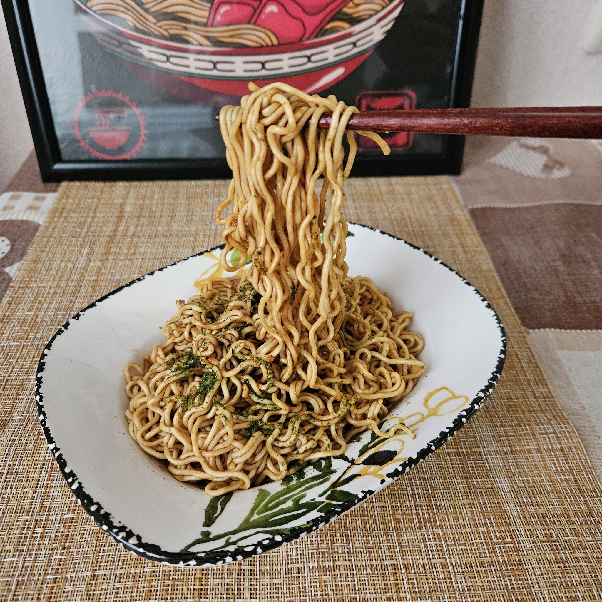 По инструкции заливаем лапшу кипятком до линии и судорожно начинаем вытирать стол, потому что долбанный Озон при доставке повредил контейнер так, что вся вода вытекла. После данного упражнения перекладываем лапшу в целую посуду и повторно заливаем кипятком, оставляем на 3 минуты под крышкой. Затем сливаем воду, добавляем соус, перемешиваем и посыпаем фурикакэ. Можно пробовать.