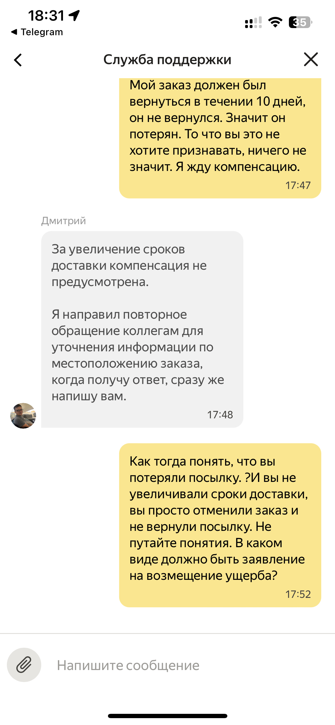 И вишенкой на торте стал срок возврата - дата отмены заказа + 10 дней. Я дождался и теперь они заливают что о компенсации речи идти пока не может, они не признали что посылку потеряли, просто она едет 🤦♂️🤦♂️
