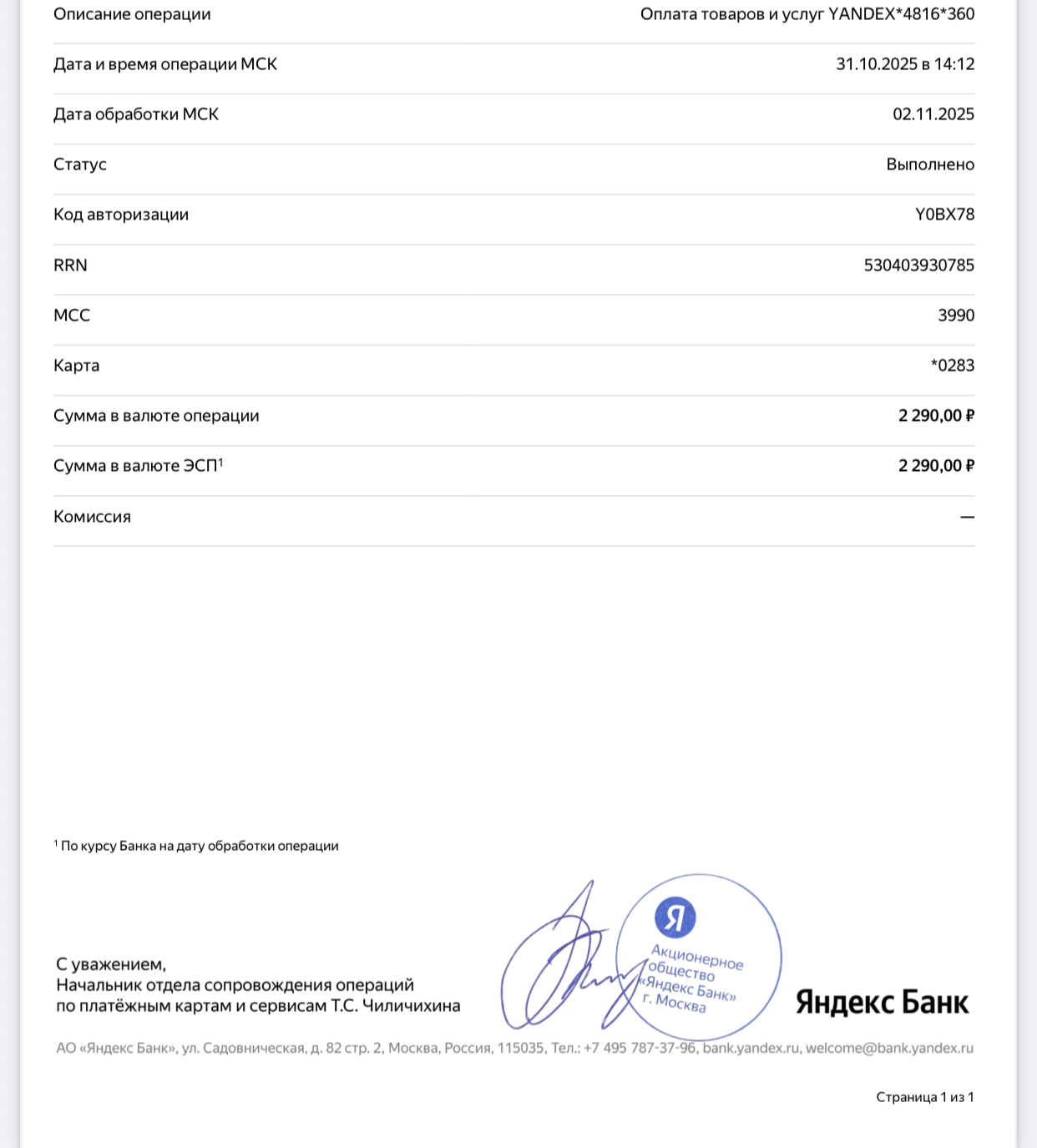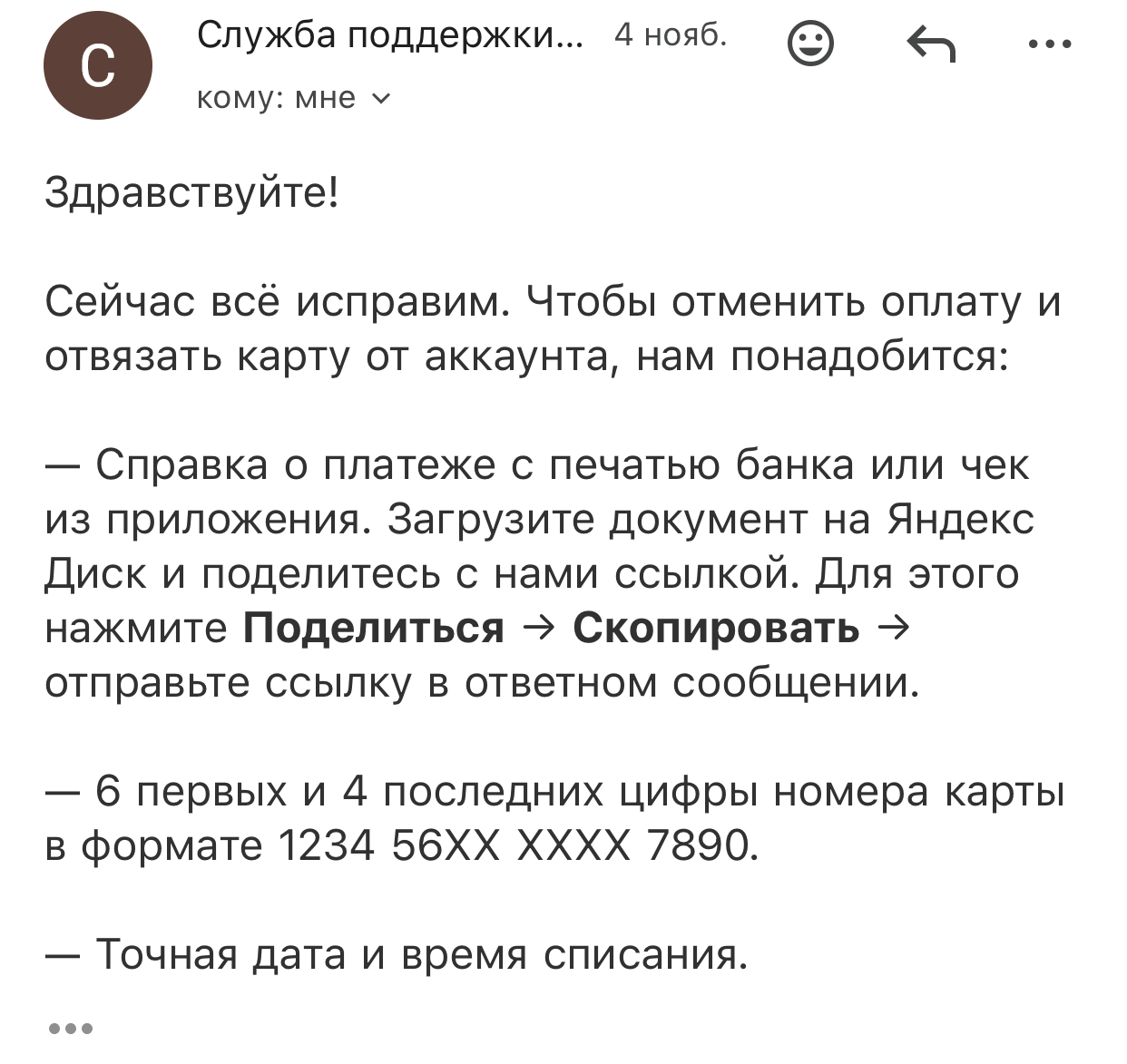 31.10.25 списали 2290 за операцию , которую не совершал. На Яндекс диске 40 мб из 10гб, никаких тарифов не подключал. Написал сразу в этот же день им , направил справку по операции , на что посоветовали найти аккаунт к которому прошла оплата и отключить …