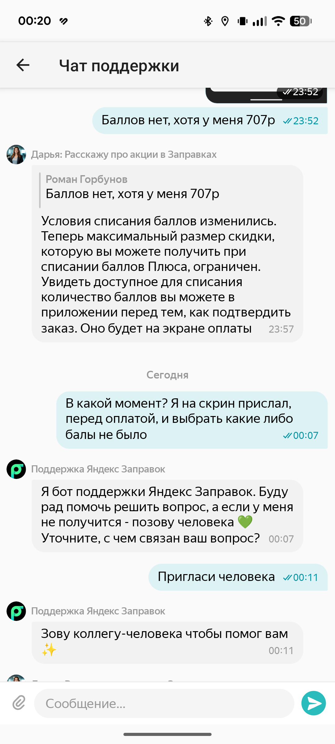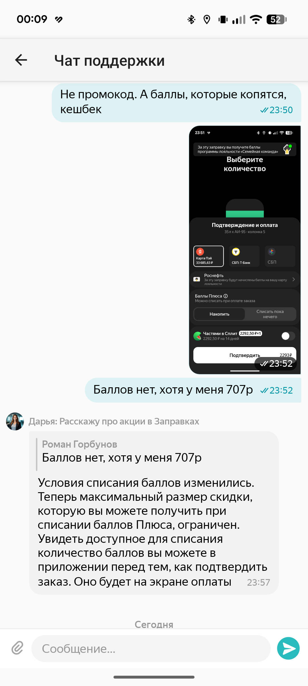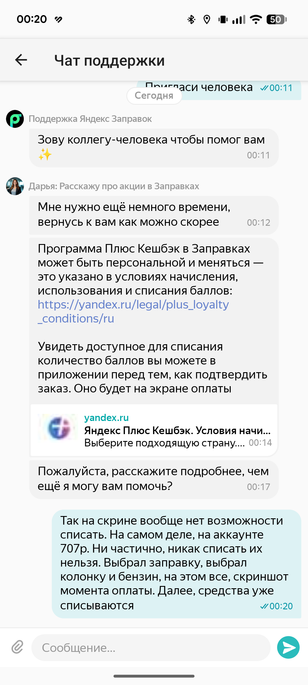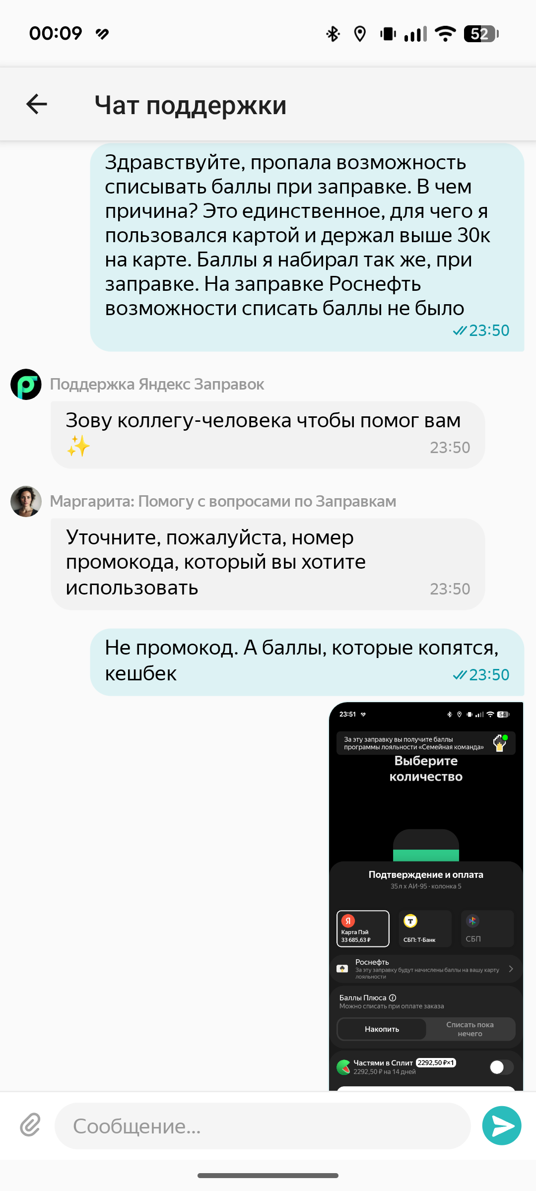 В какой-то момент меня снова перекинули на бота, позвал снова. То ли я не понимаю, то ли, действительно обман. В какой момент можно списать баллы, которые я на этих же заправках и копил, непонятно