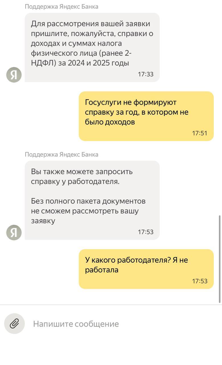 Ни на Госуслугах, ни в Моем налоге невозможно сформировать справку за 2024 год, потому что я НЕ работала. Я отправляла в Яндекс.Банк свидетельство о рождении ребёнка - мол, вот, смотрите, вместо вашего документа у меня есть другая писулька. Им, как говорится, буква Ю на барабане.