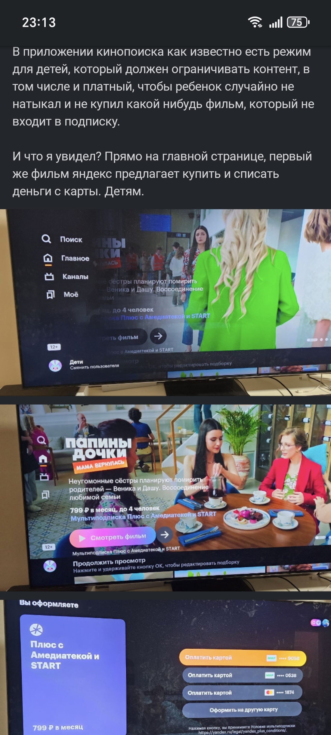 Вопрос к яндексу, какого собственно хрена происходит? почему вы даете возможность детям оформлять какие-то подписки с привязанной карты родителей? и зачем вообще тогда нужен детский режим?