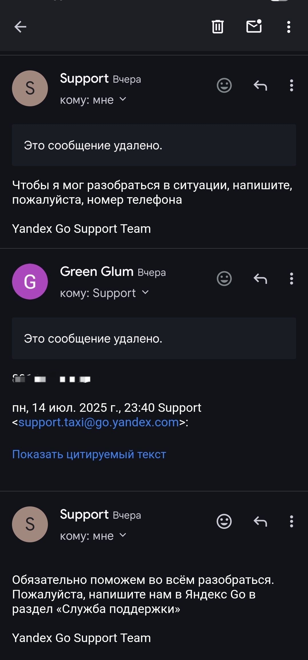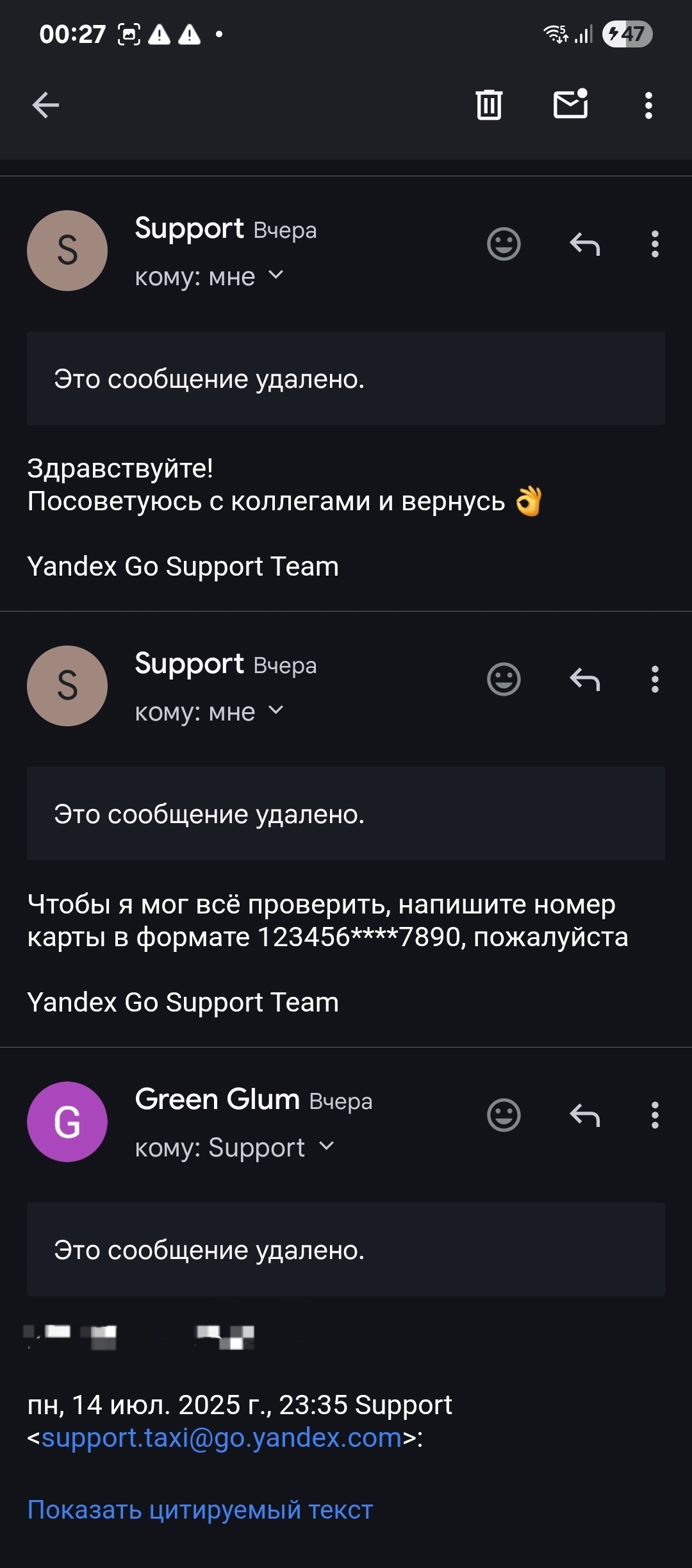 Обратился в службу поддержки support.taxi@go.yandex.com, все объяснил, приложил скриншоты. Они, ок, разберёмся, только дайте данные карты. Я - держите. Они - а номер телефона не подскажите. Я - конечно. Они - (хуй знает зачем все это у вас уточняли) обратитесь в поддержку Яндекс go.