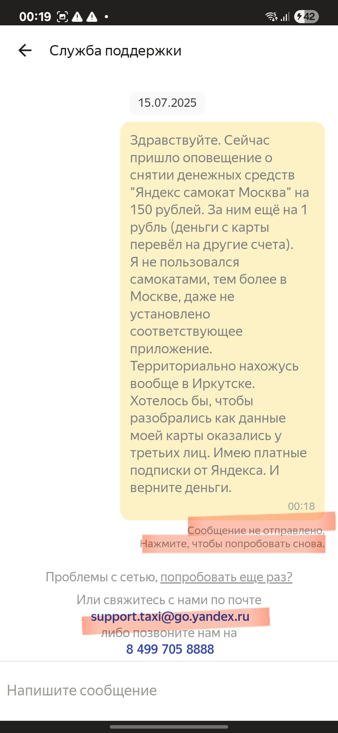 Бля, я написал в поддержку Яндекс go через обращения обратной связи. Сообщил support.taxi@go.yandex.com. Те, нихуя обращайтесь в чат. Я уже в чате дублирую текст обращения... И... Хуй! Обращение в чате не отправляется. Предлагают написать на support.taxi@go.yandex.com! Я опять туда же, говорю, ваш чат не работает. Они - обращайтесь в Яндекс go...