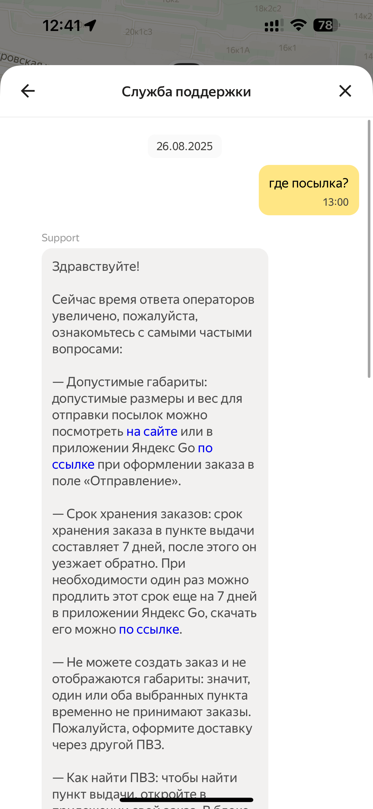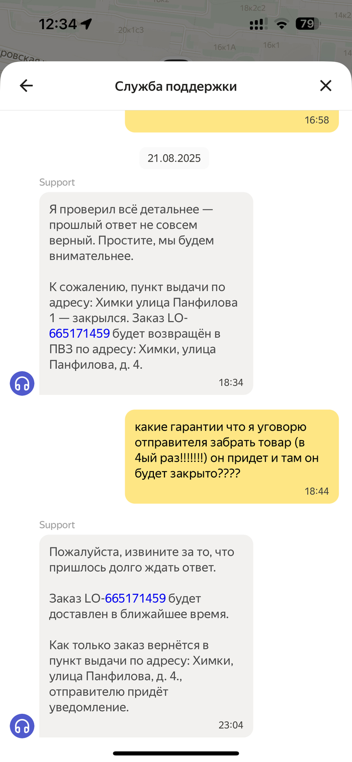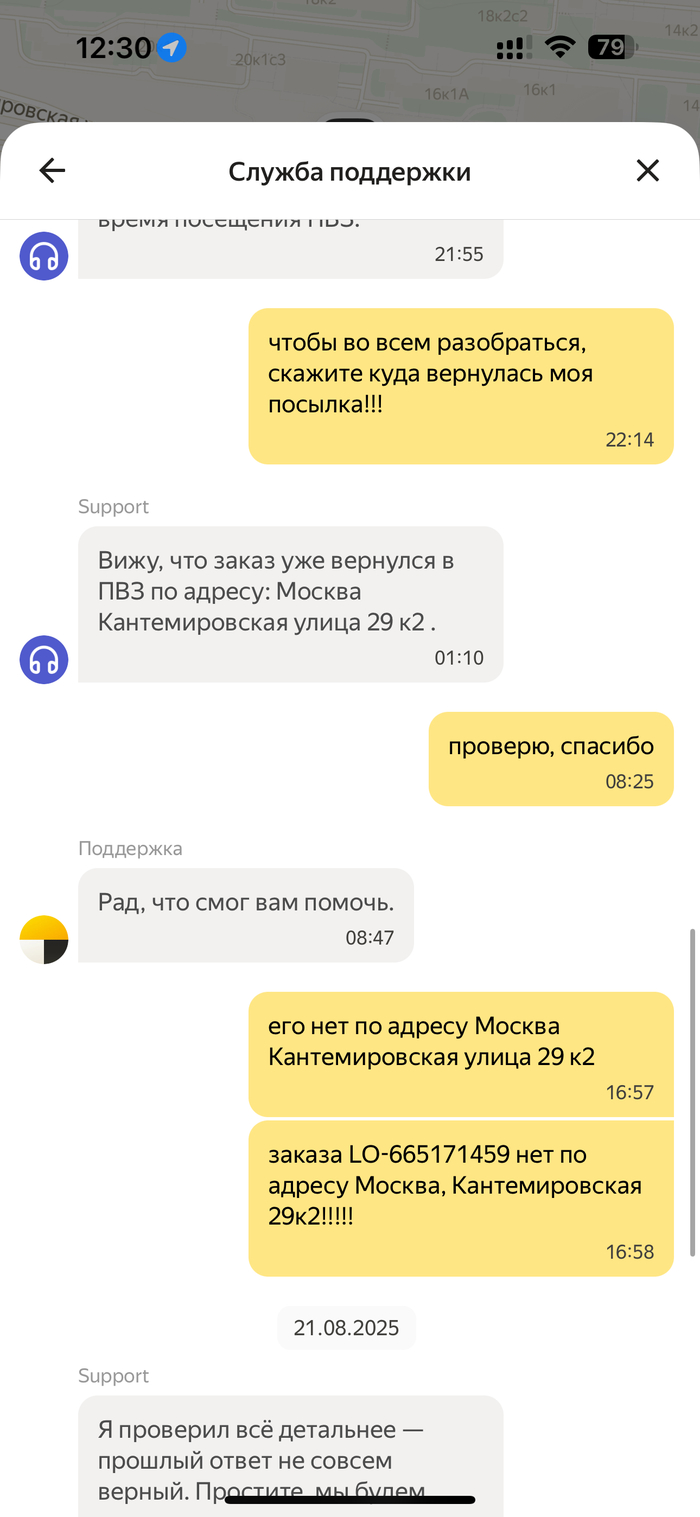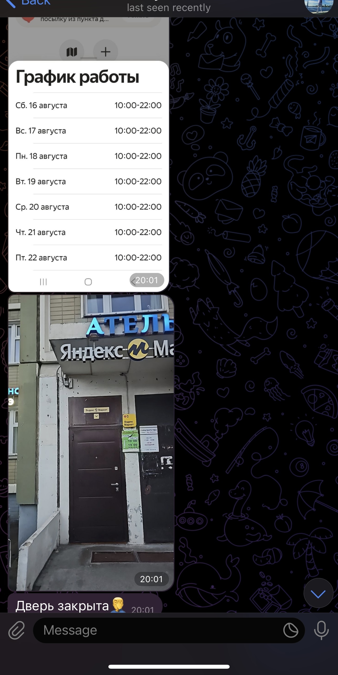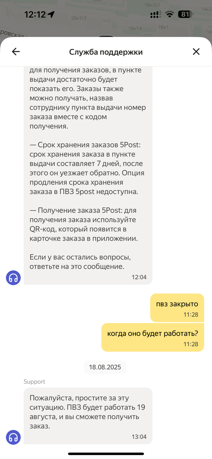 16 августа согласно приложению Яндекс Go - посылка вернулась в ПВЗ, откуда ее отправляли и я попросил Руслана вернуться (хотя у человека есть чем заняться, кроме как ходить в ПВЗ). Согласно Яндекс Картам - ПВЗ открыто и работает без выходных. По факту придя в ПВЗ 16 и 17 августа, оно было закрыто! И Руслан был очень зол, а я не знал что делать, кроме как жаловаться в поддержку, которая отвечает через раз.
